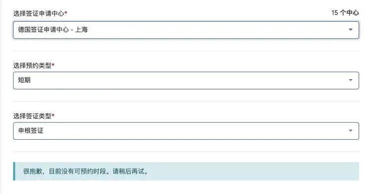 记者27号晚在德国申根签证官方预约网站上进行了尝试,结果上海的德国签证申请中心直接提示:“很抱歉,目前没有可预约时段。请稍后再试。”
