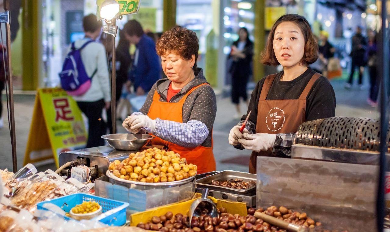 图为首尔明洞大街的小吃摊位。每逢中国传统佳节期间,明东大街的免税店里到处都是带有中国春节元素“福”字的广告牌,以此来吸引游客。(图片来自东方IC)