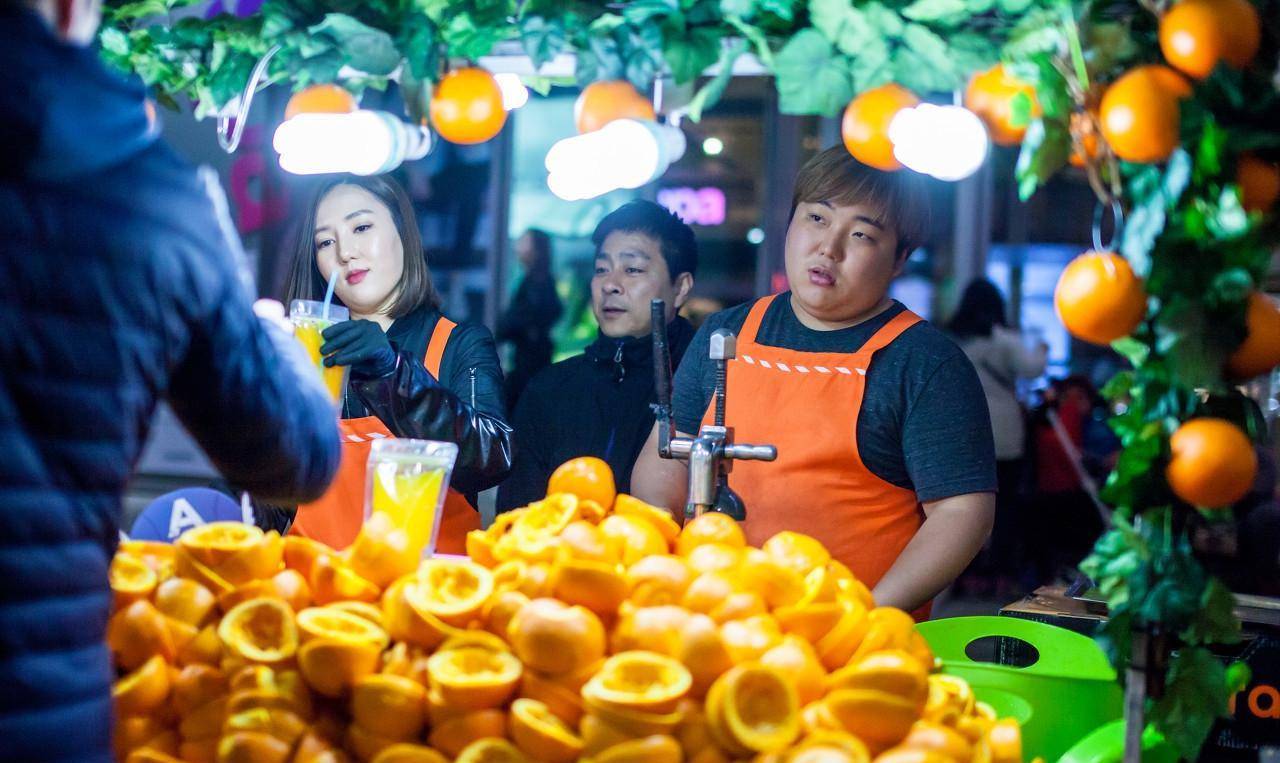 图为明洞大街一个橙汁摊位。明洞大街被誉为“购物天堂”,这里曾是众多中国游客来韩国首尔旅游的首选血拼地。曾有中国游客表示,“这哪里像是韩国,都是咱中国人,都在说中文,就像咱中国大市场一样。”不过这种迹象近些年有所改变。(图片来自东方IC)