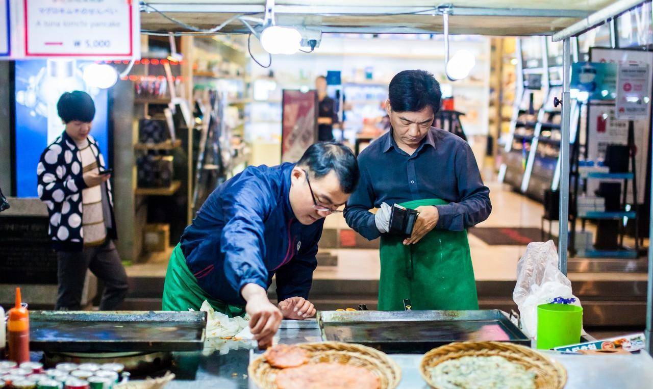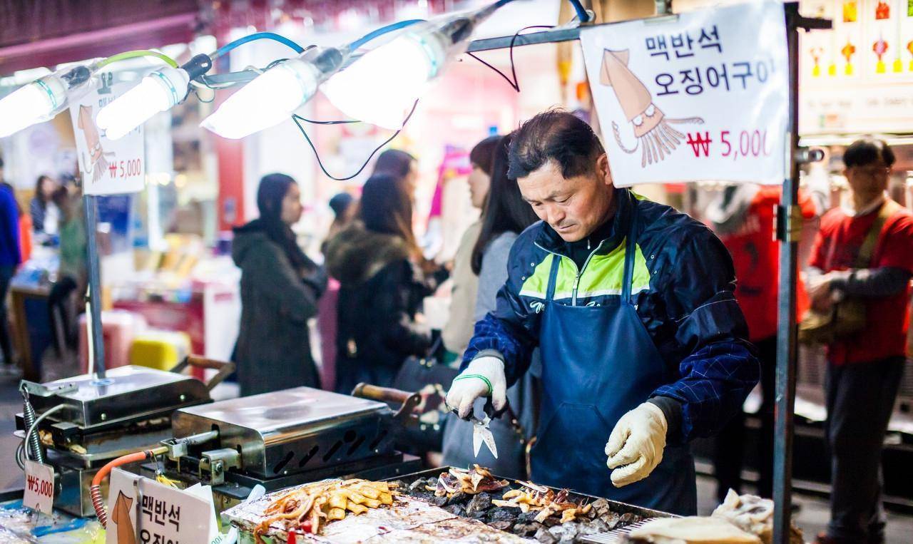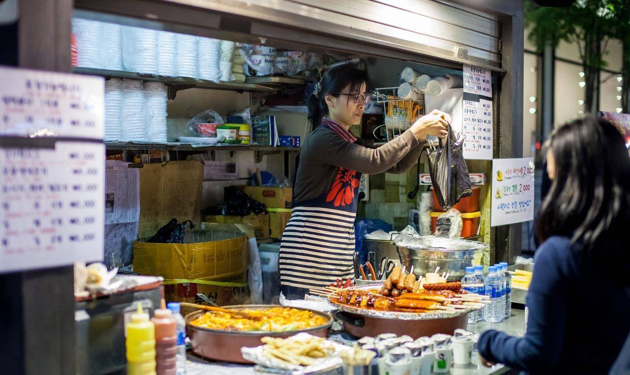 图为明洞大街的一个小吃摊位。曾几何时,这里中国游客随处可见,如今中国游客数量锐减。(图片来自东方IC)