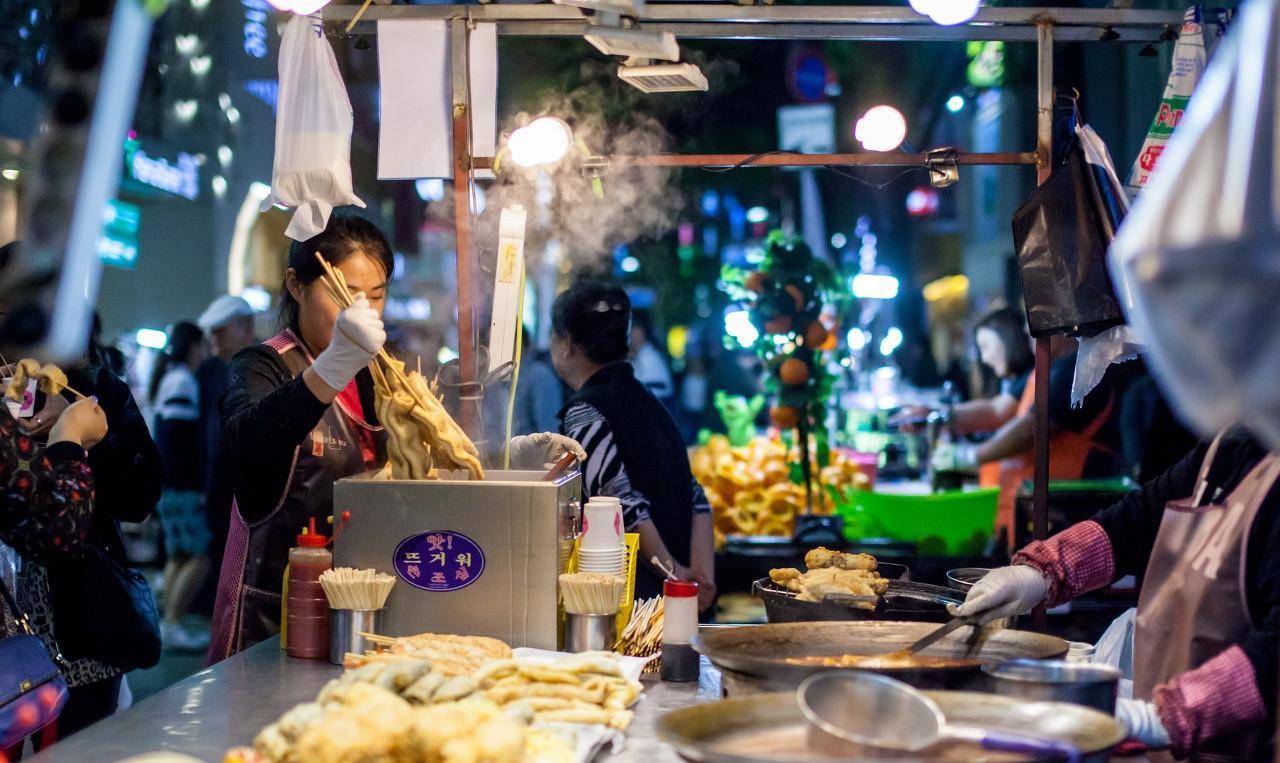 明洞大街,位于韩国首尔市中区,是一条著名的小吃街。每当夜晚降临,这里各种小吃摊位层出不穷。此外,这里有美容店、银行、剧场等设施为前来的游人提供方便。(图片来自东方IC)