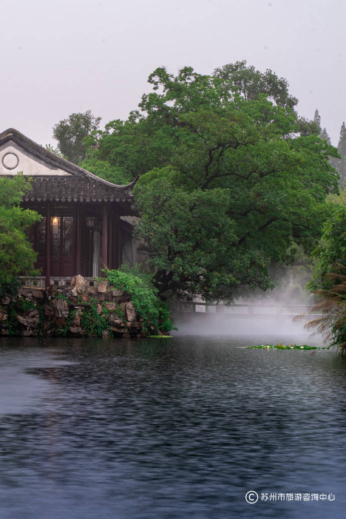 苏州沧浪亭前的一汪清水,就像是一个天然的舞台,任梅雨肆意挥洒,尽情舞动,石桥上、河岸边、或水廊中,每个角落都是观雨的绝佳位置。若你不赶时间的话,不妨静静坐在厅堂里、古亭下,听风吹潇潇竹,看雨打芭蕉叶,那悠悠然的声响,会让你“心静自然凉”。