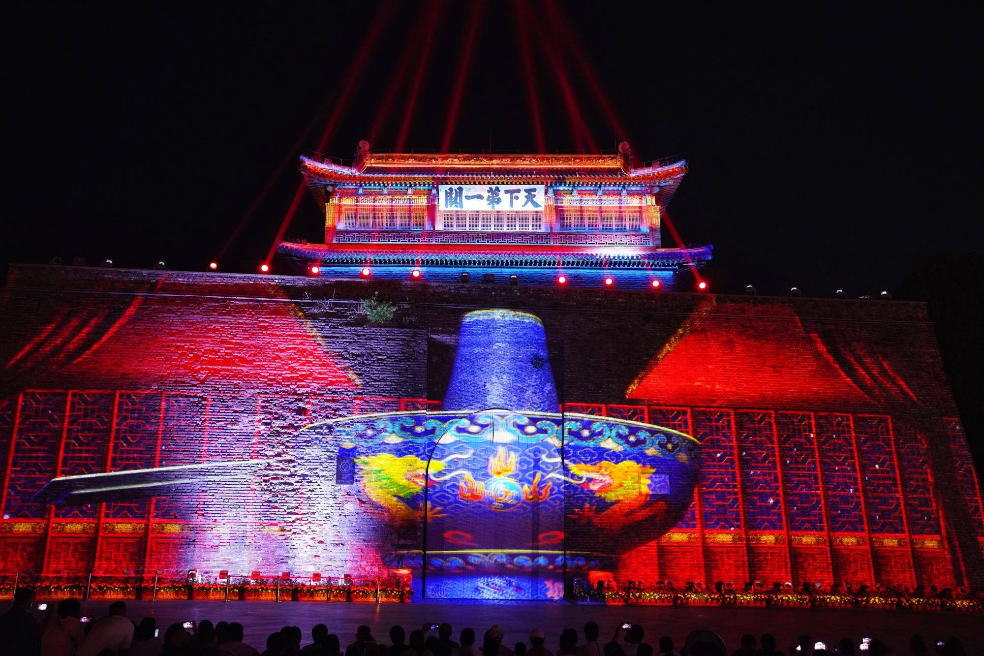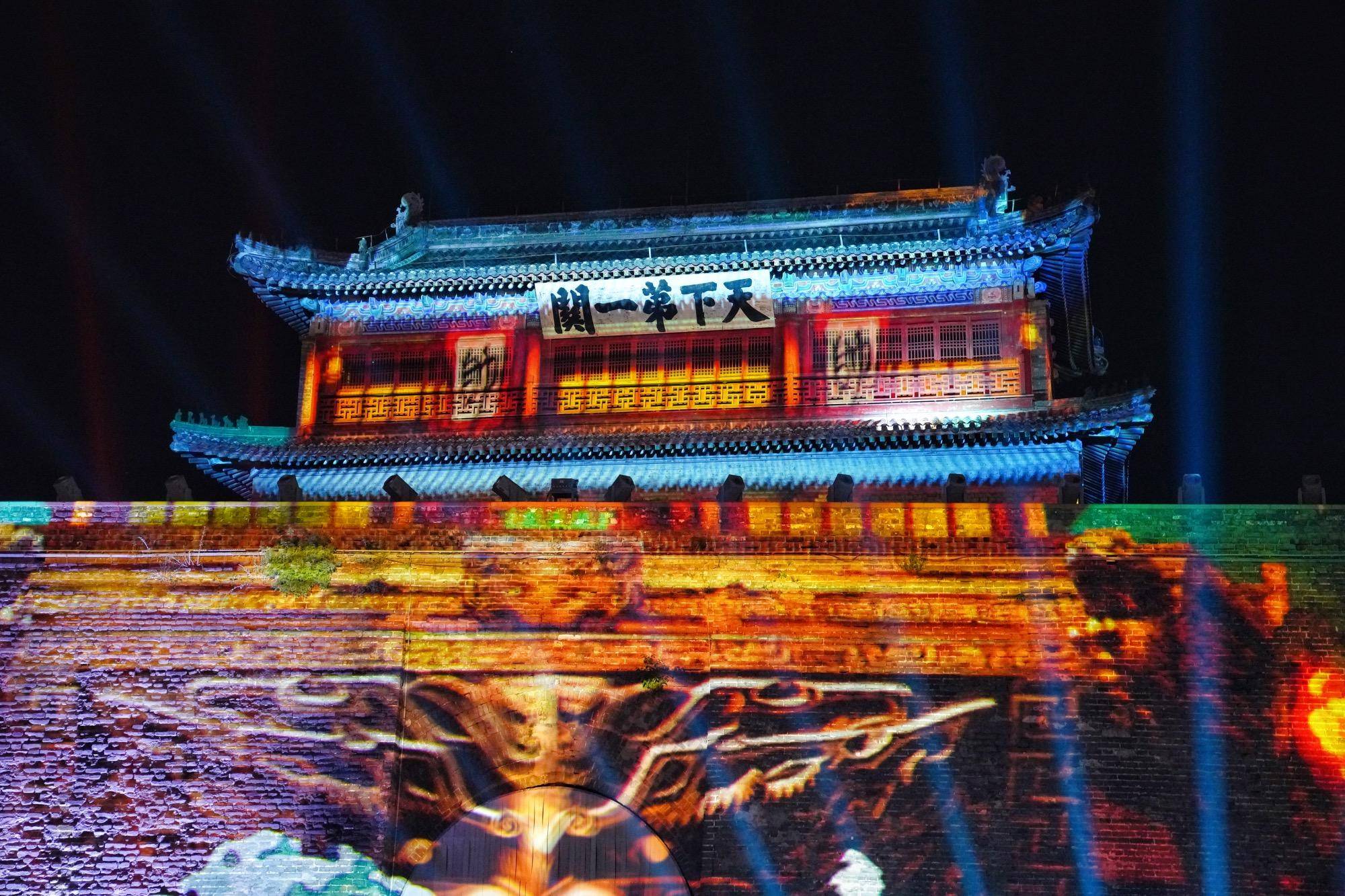 每天20:30,光影交错伴随着气势恢宏的背景音乐,在天下第一关城楼上展开一幕幕山海关历史画卷,“山海雄关”、“英雄往事”、“关里关外“、“万里长城”、“大观世界”五个主题,带人们穿越千年,感受万里长城第一关的往昔历史和未来画卷。