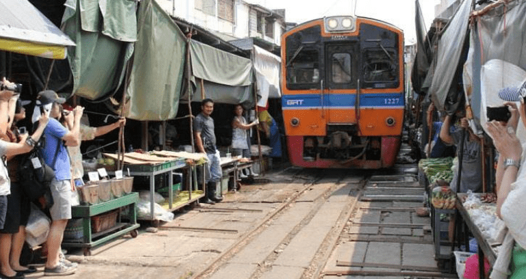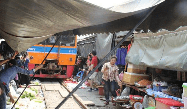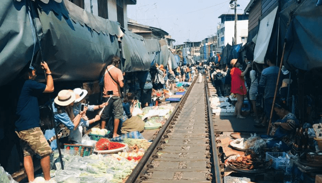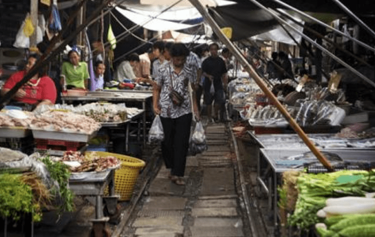 泰国作为一个文化色彩浓厚的国家,吸引了海外各国游客的眼球,哪怕没有亲身踏足过的朋友,也一定对他们国家的习俗礼仪、人文环境、自然景观等都有所耳闻,它是一个旅游资源极为丰富的国度。说到泰国,我们能想到它的多元性和包容性,也知道他们热情好客,可是让咱们没想到的是,他们为了赚钱,也挺“拼命”的,为啥这么说?你可能还不知道他们那的商贩是怎么做生意的,他们会把菜摊直接摆在火车铁轨的两侧,甚至会延伸到铁轨中央去,关键是这还是条正在运营中的铁轨,这让游客们既惊诧又纳闷:这火车开过来了,他们要往哪里跑呢?躲得及吗?