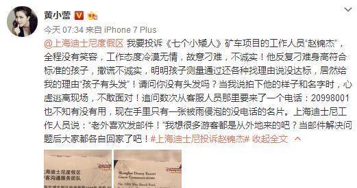 同样是昨天,黄小蕾带着女儿从北京飞上海,因女儿身高不达标好多项目不能玩,终于找到一个可以玩的《七个小矮人》项目时,可工作人员反复刁难身高不符合标准,还以“孩子有头发”为由拒绝她们。
