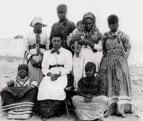 > 非洲南部妇女,这张团体画像发表在《柏林新闻报》上,展示了殖民时期穿着连衣裙和带头巾的女性