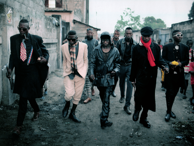 > 刚果的Sapeurs穿着两件式西装、皮靴和冬季围巾,漫步在布拉柴维尔的一个小镇上
