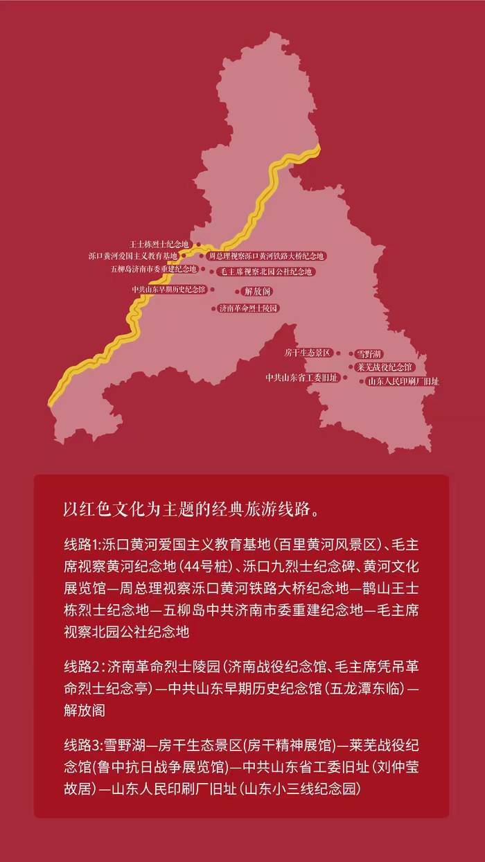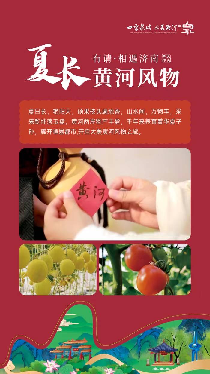 观黄河险工,赏地上悬河。夏日的泉城之约始于以舜文化、治河险工景观为主题的经典旅游线路,经由黄河文化展览馆、大明湖、宽厚里等特色景观景点,便可开启一段治河之旅。以红色文化为主题的经典旅游线路通过三条特色线路对泺口黄河爱国主义教育基地、济南革命烈士陵园、山东人民印刷厂旧址等红色足迹的重访,传承红色基因;以时令风物、采摘游园、农业观光为主题的特色旅游线路以采摘游为主线,开启黄河风物之旅;以研学为主题的特色旅游线路围绕文旅融合探寻古迹,感受中华上下五千年的璀璨文化。
