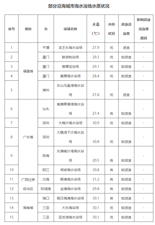 平潭龙王头海水浴场、厦门鼓浪屿浴场、厦门曾厝垵浴场、厦门黄厝海水浴场、漳州东山马銮湾海水浴场、深圳大梅沙海水浴场、深圳大鹏湾下沙海水浴场、三亚大东海浴场、三亚亚龙湾海水浴场共9个海水浴场水质为优。
