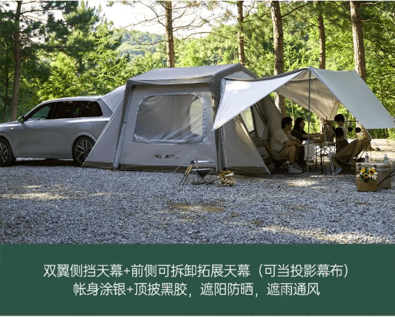 理想 x 牧高笛充气车尾帐篷,完全适配理想全系列车型,车尾与帐篷紧密贴合,玩转15平米大空间,共享温度;一体式脊椎架构,一充即成,轻松搭建。