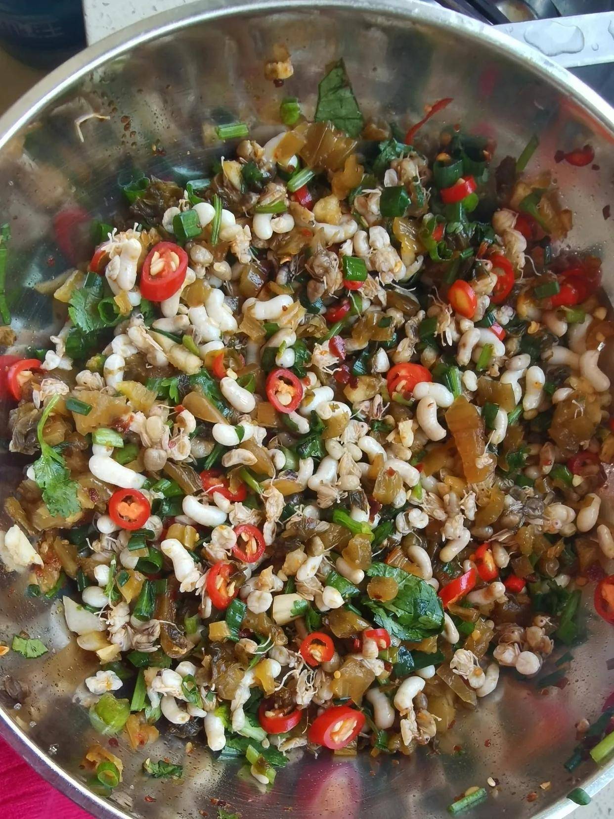 凉拌蚂蚁蛋,是一道传统的中华美食,是以蚂蚁卵为主要原料制作的凉菜。蚂蚁蛋是傣家的一道传统名菜,由生长在树上的黄蚂蚁所产,不仅味道鲜美,而且具有很高的营养价值。