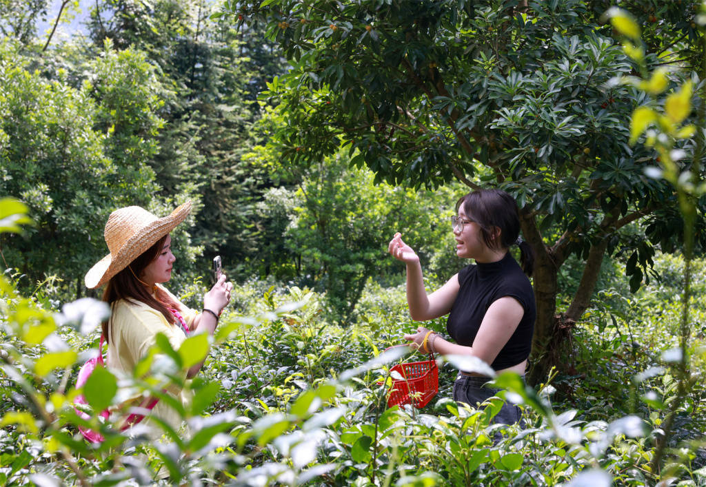 中午时分即便烈日炎炎,但杨梅基地却热闹不已,前来采摘体验的游客、把直播开在田间地头的驻村干部,还有大学生暑期“三下乡”的社会实践团队,他们用镜头传递村里产业兴、生态美,助推农副产品“出圈”。