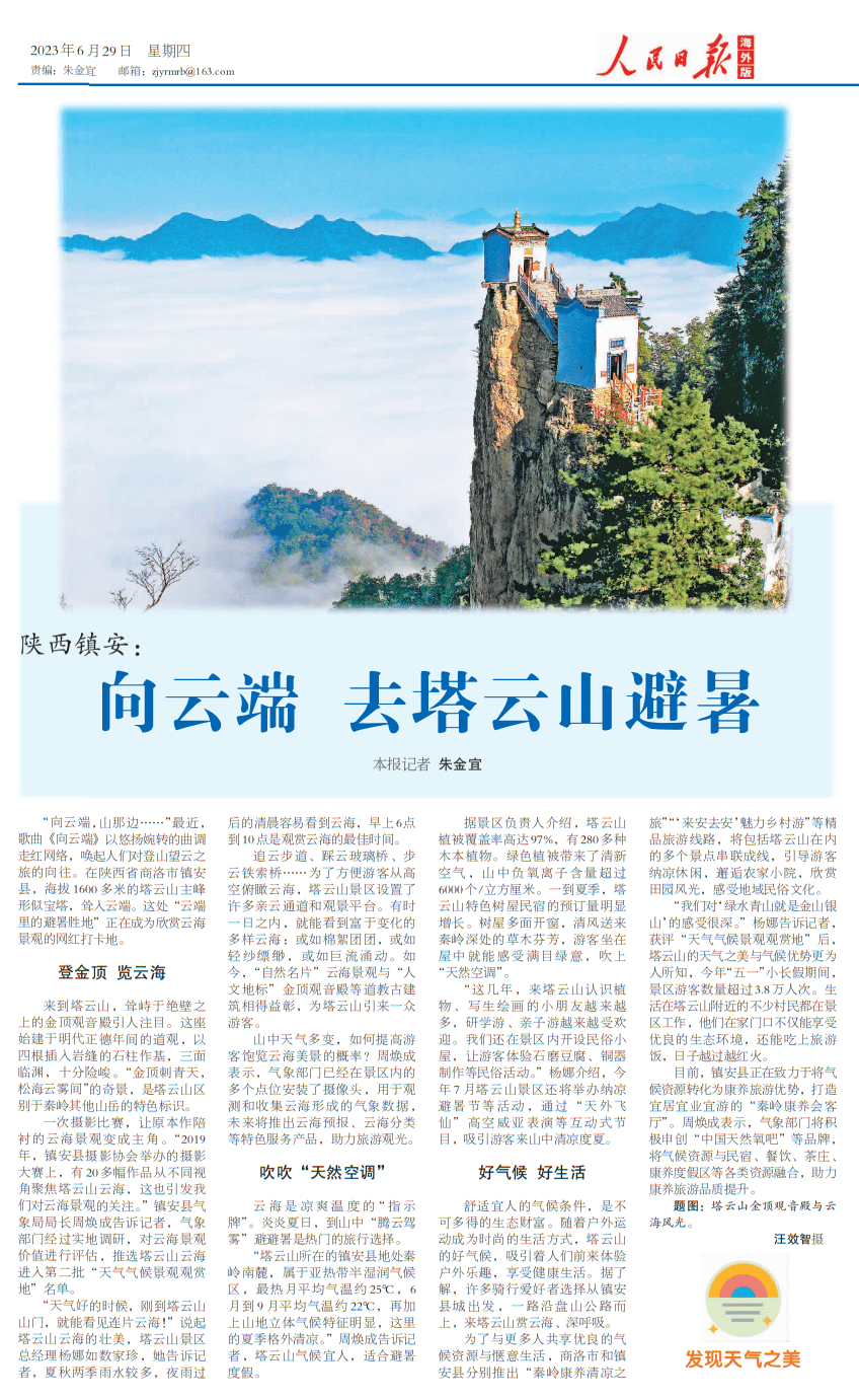 近日,《人民日报》海外版记者朱金宜对陕西塔云山旅游开发有限责任公司总经理杨娜进行了专访,称赞塔云山:“云端里的避暑胜地”。