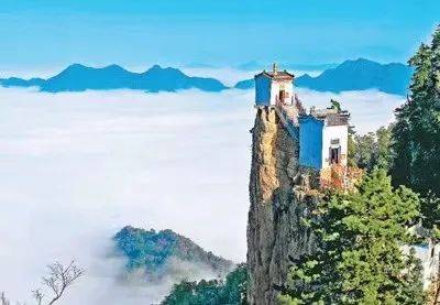 来到塔云山,耸峙于绝壁之上的金顶观音殿引人注目。这座始建于明代正德年间的道观,以四根插入岩缝的石柱作基,三面临渊,十分险峻。“金顶刺青天,松海云雾间”的奇景,是塔云山区别于秦岭其他山岳的特色标识。