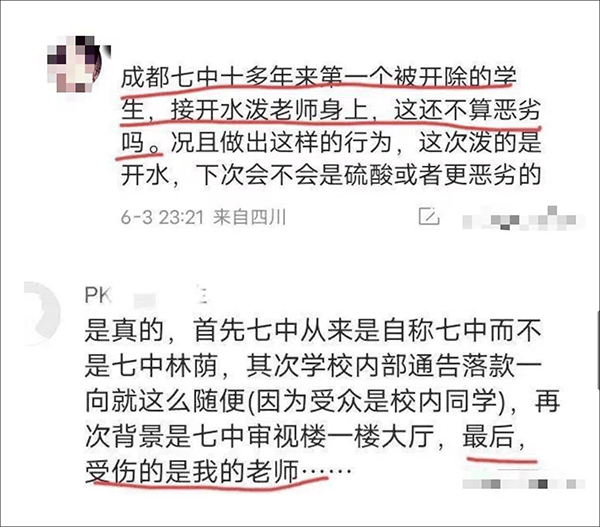 另外,据自称知情网友透露,涉事学生向教师泼开水,并称这是成都七中十多年来第一次开除学生。