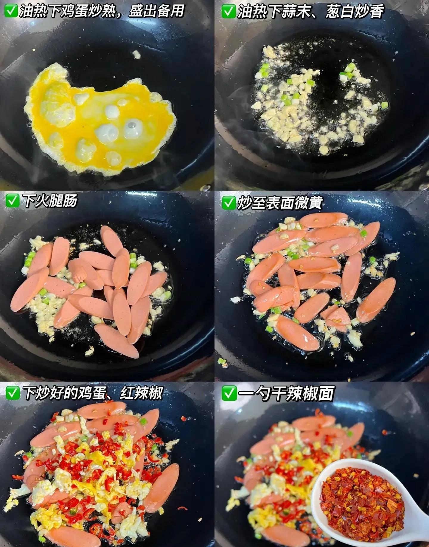 1:首先我们将鸡蛋炒散备用,另起锅烧油放葱蒜爆香,加入我们切好的火腿肠炒熟之后放入炒好的鸡蛋和红辣椒,我喜欢爆辣的那种感觉,所以又加了一勺干辣椒面!