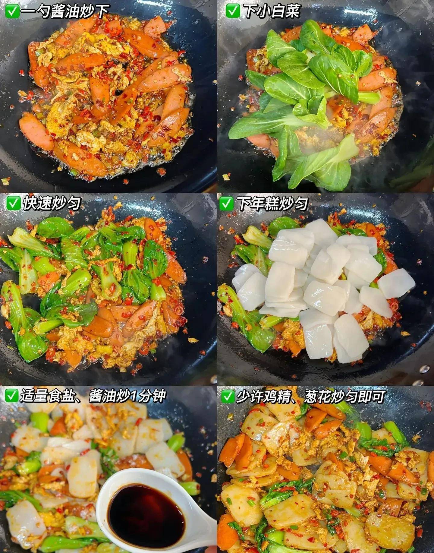 2:来点酱油先调个味,然后再加入小白菜,断生之后加入年糕,年糕可以提前用清水洗一下,这样炒起来不容易粘锅,炒熟之后来点酱油、鸡精和葱花调味,大火翻炒两下之后准备出锅!