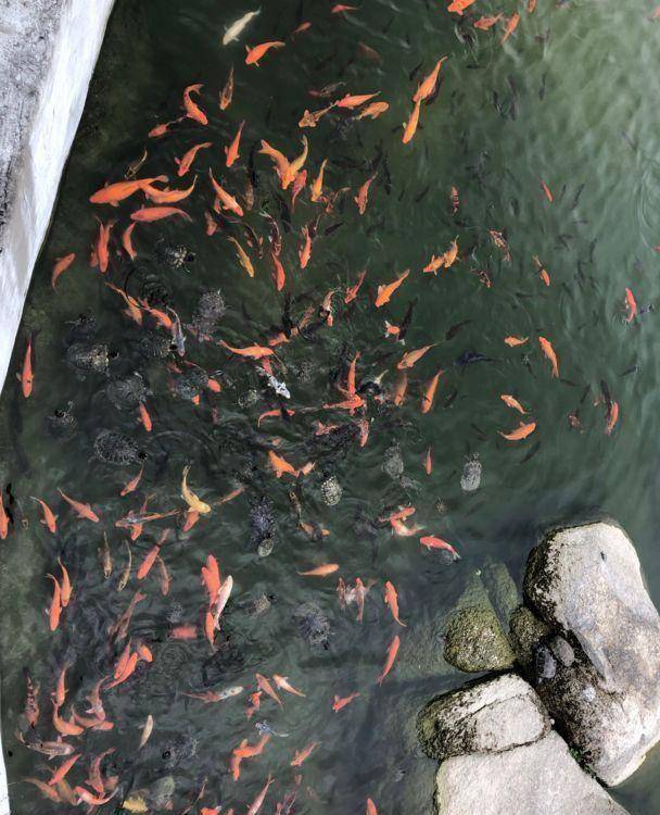 漫步在风动石景区里,看一条条锦鲤在放生池里争先恐后地抢鱼食。