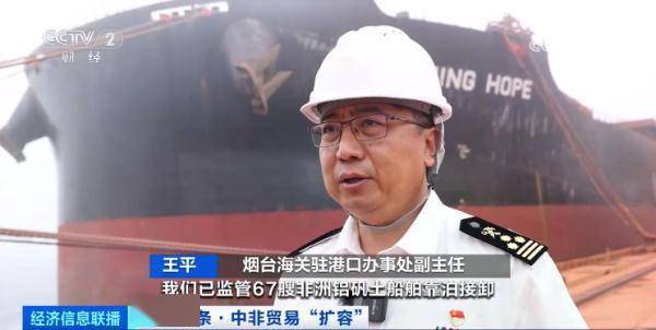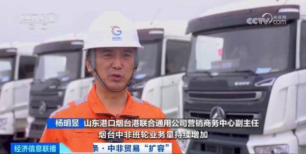 山东港口烟台港联合通用公司营销商务中心副主任 杨明昱:今年以来,烟台中非班轮业务量持续增加,目的地涉及非洲几内亚、坦桑尼亚、南非等十余个国家,出口件杂散货和进口铝土矿双向发运量稳步提升。