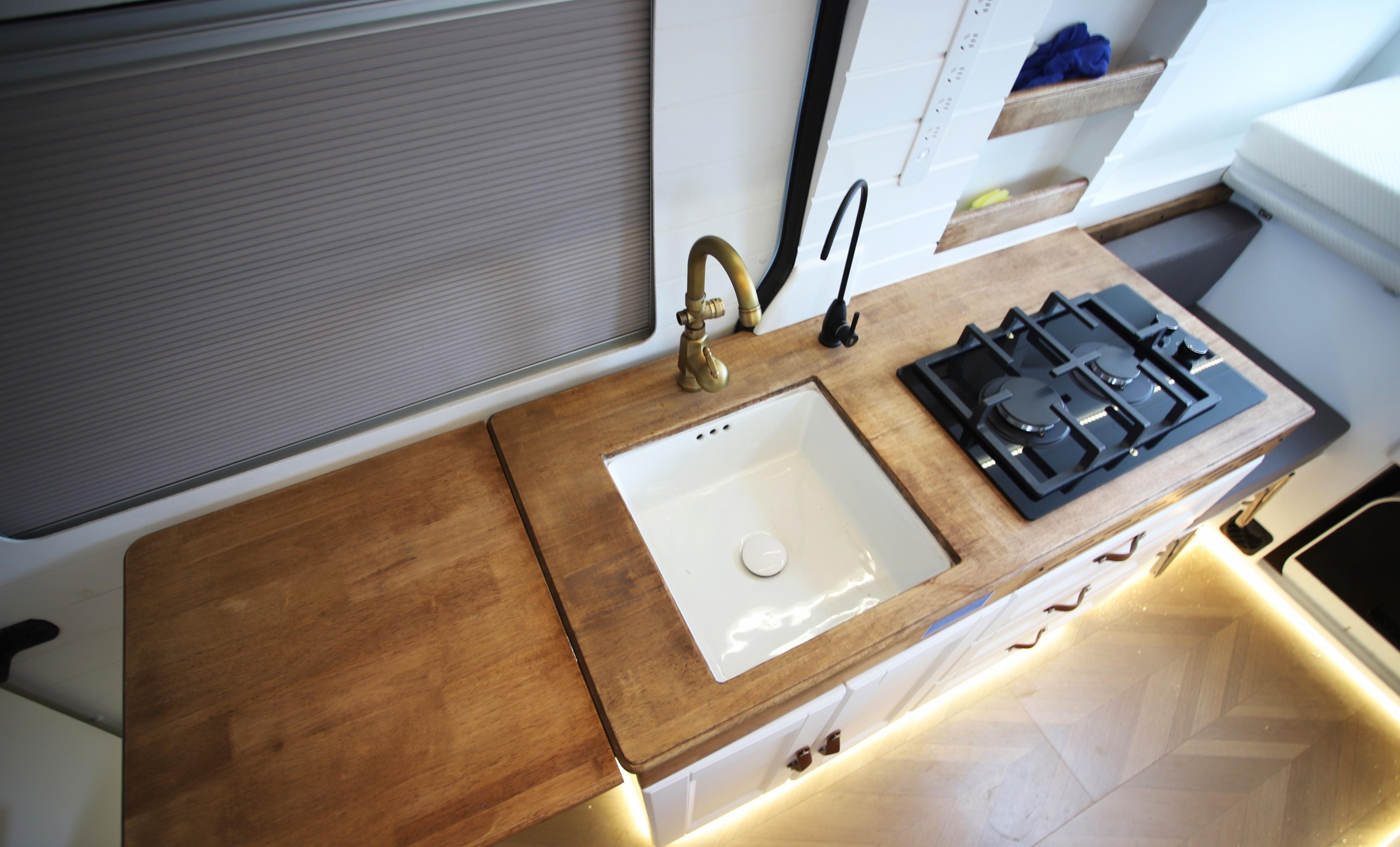 对侧厨房,也采用橡木实木打造,外侧设有折叠拓展板,厨房台面放置有陶瓷洗手池、双眼燃气灶、电源插排、储物架与底部多个分层式储物柜。
