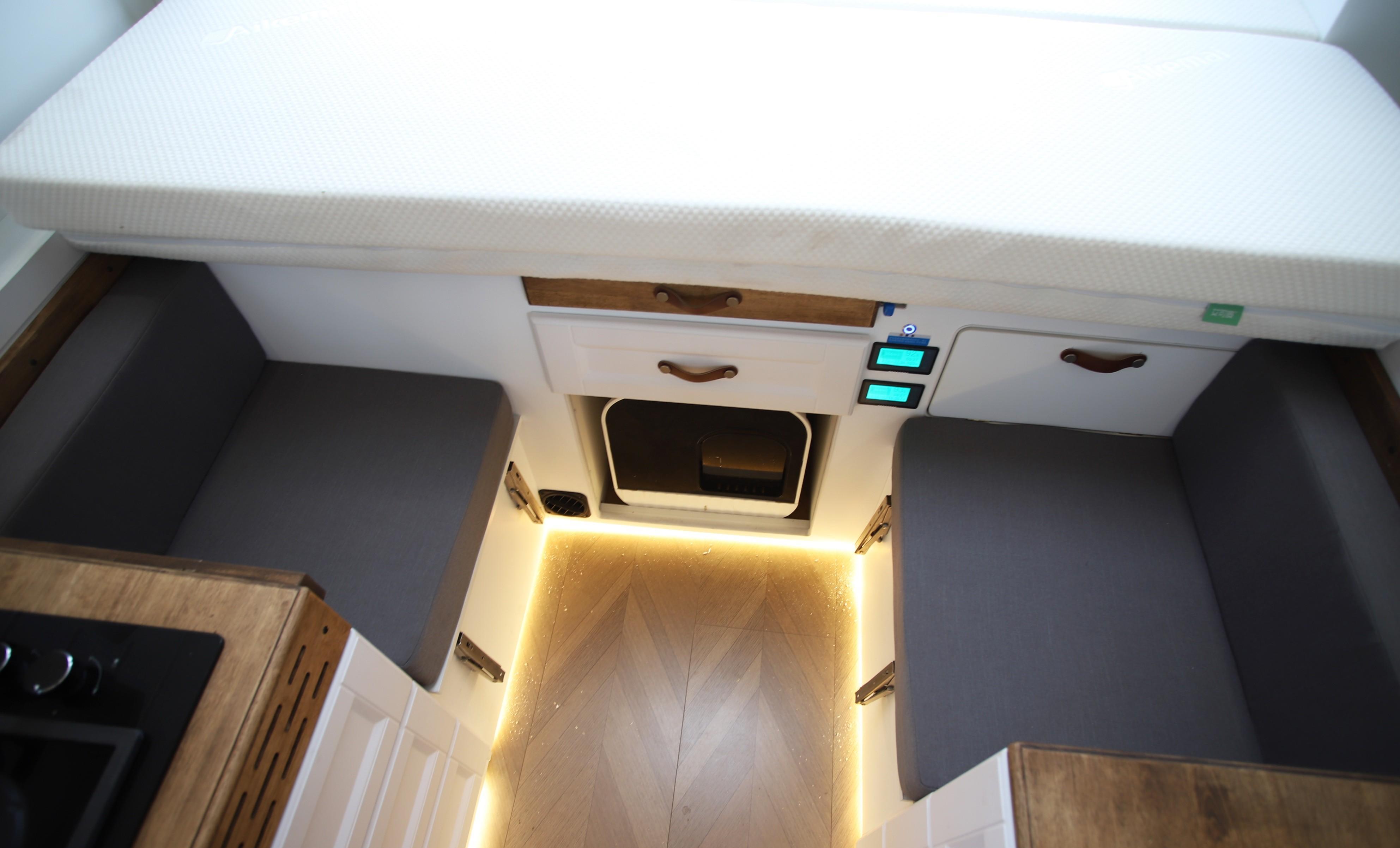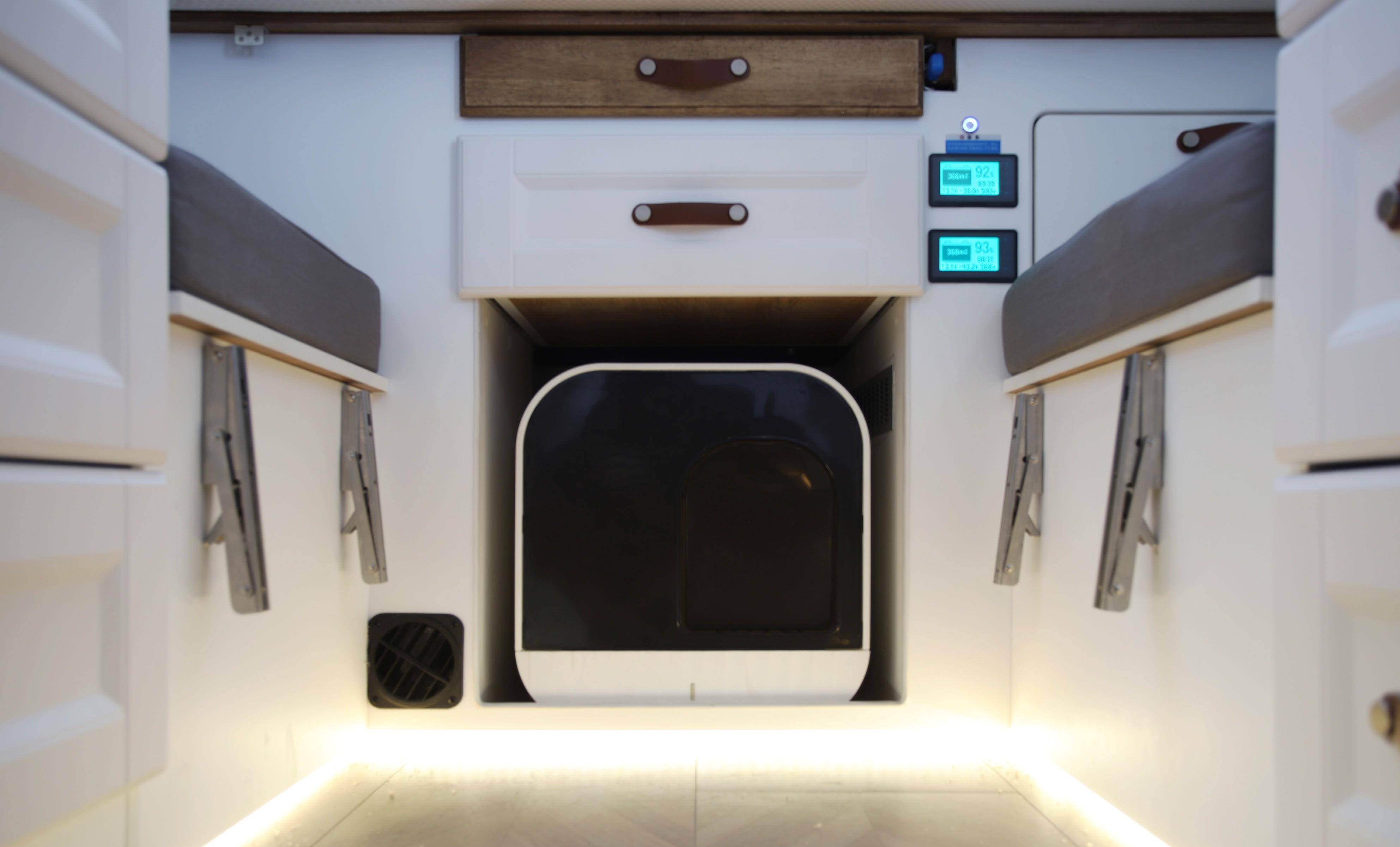 储物柜内部还隐藏一台微波炉和一台12V底置分体变频单冷空调。取暖系统则标配一台底置燃油暖风系统。