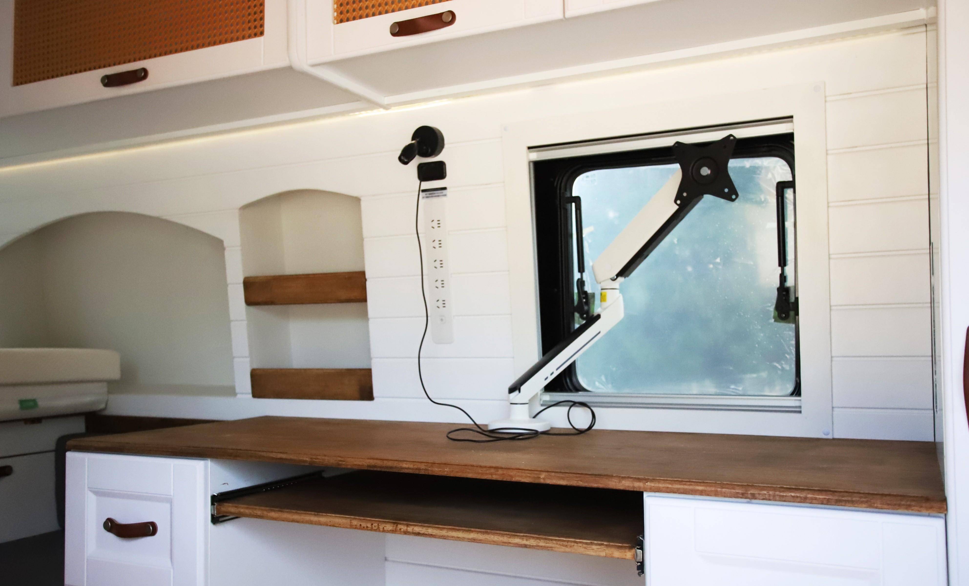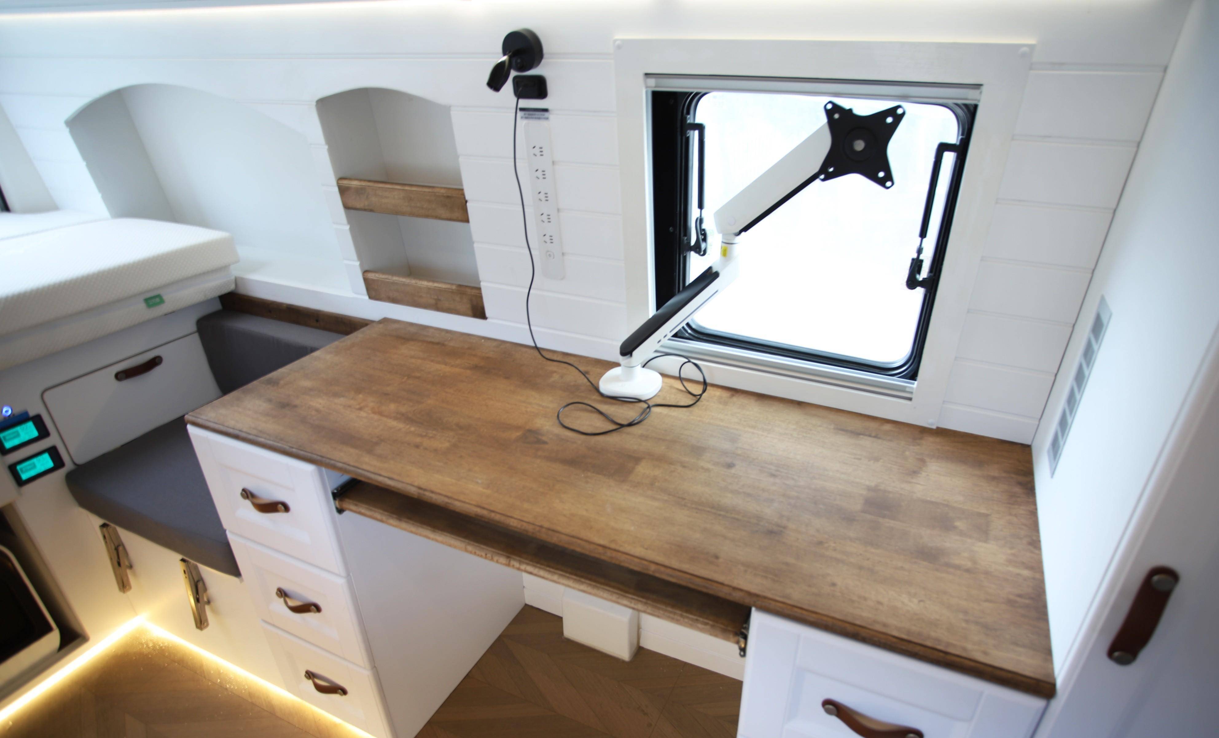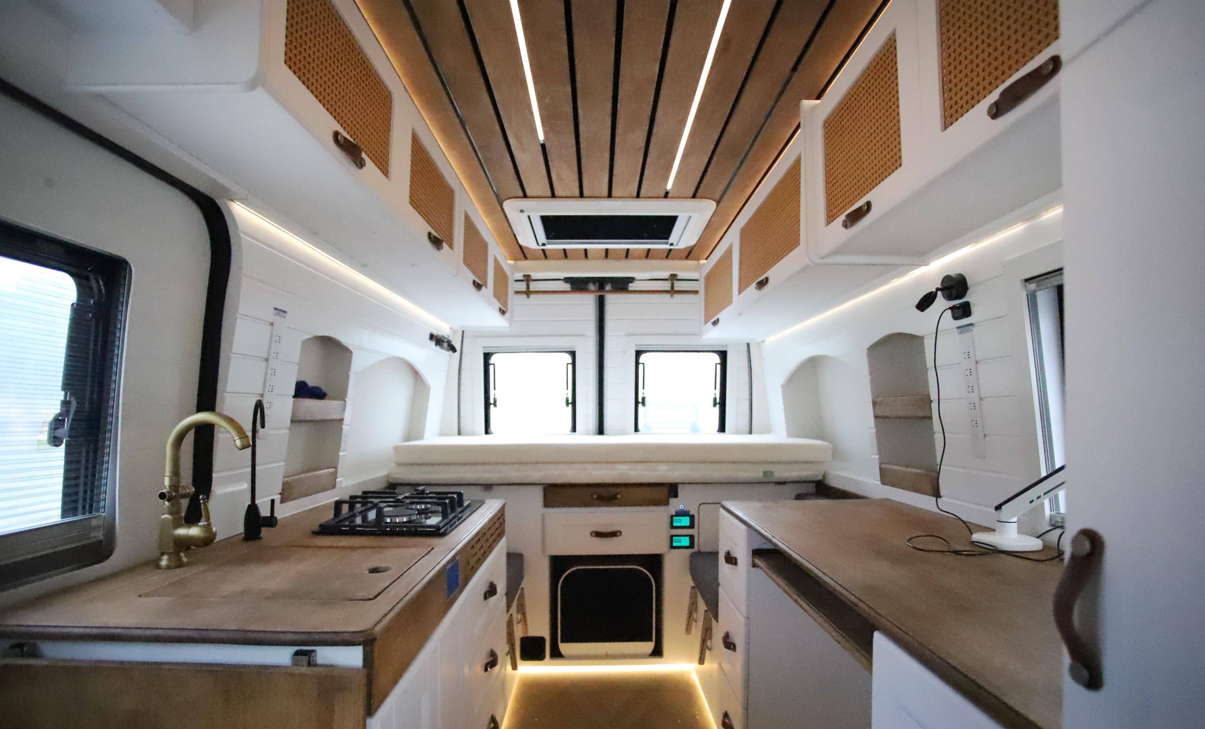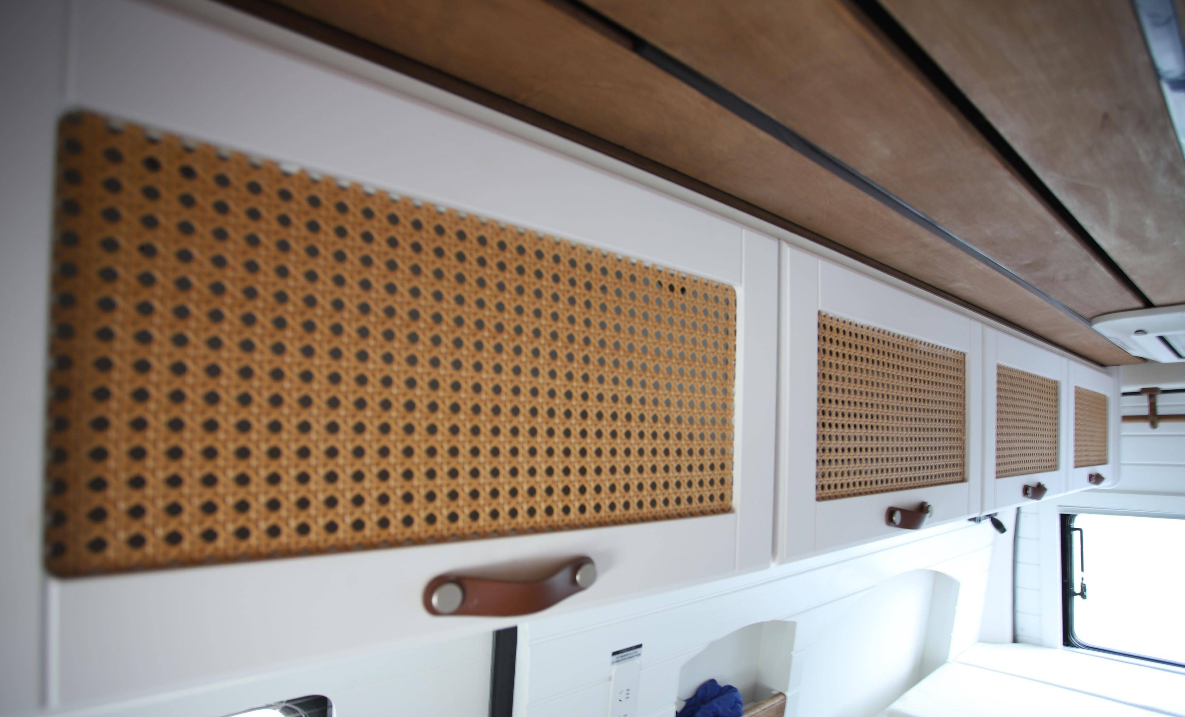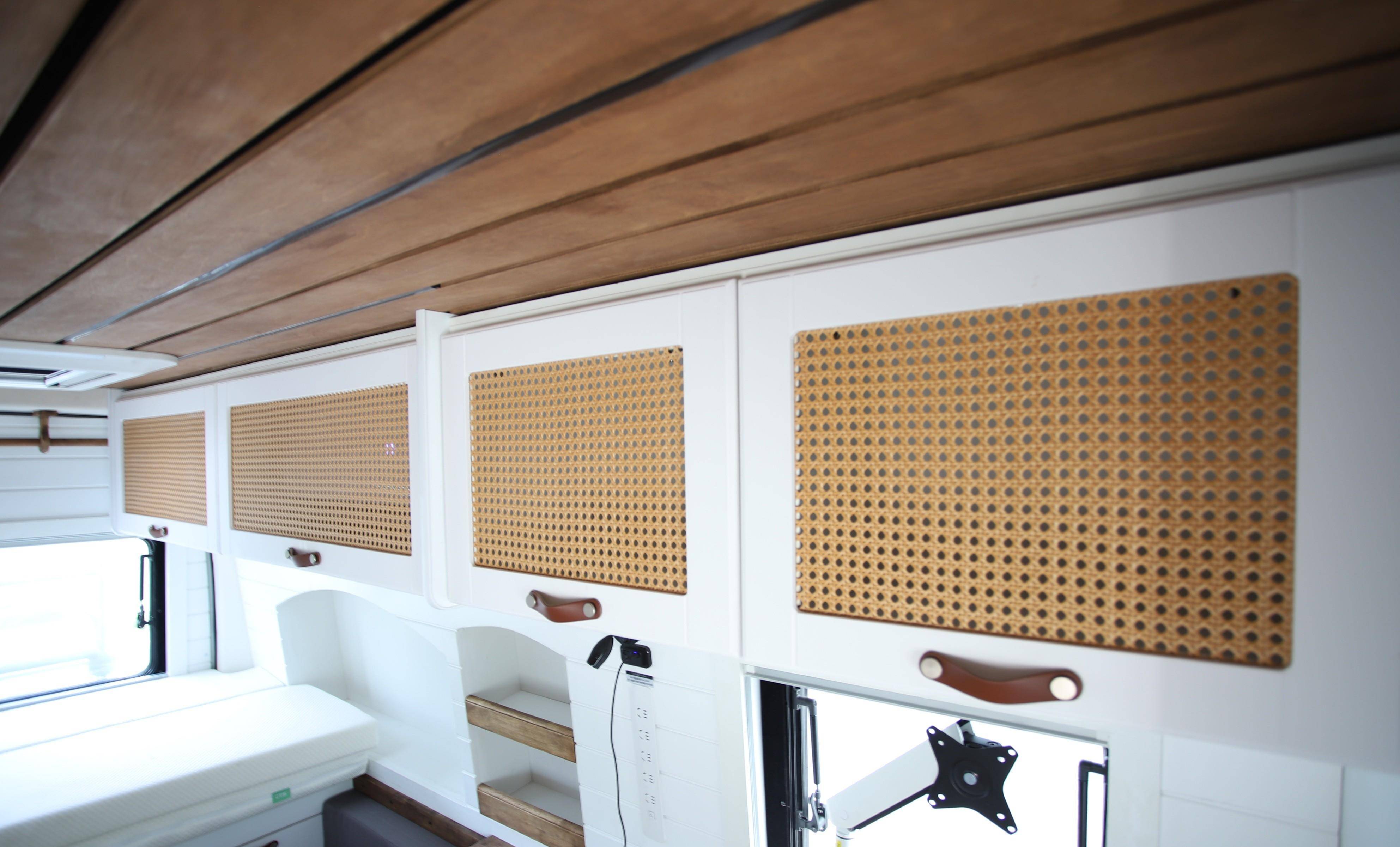 值得一提的是,为了增强车内的储物空间,这款车在厨房和办公桌顶部各吊装了两组共计8个储物柜,并全部采用藤编设计,跟车内整体风格相得益彰。