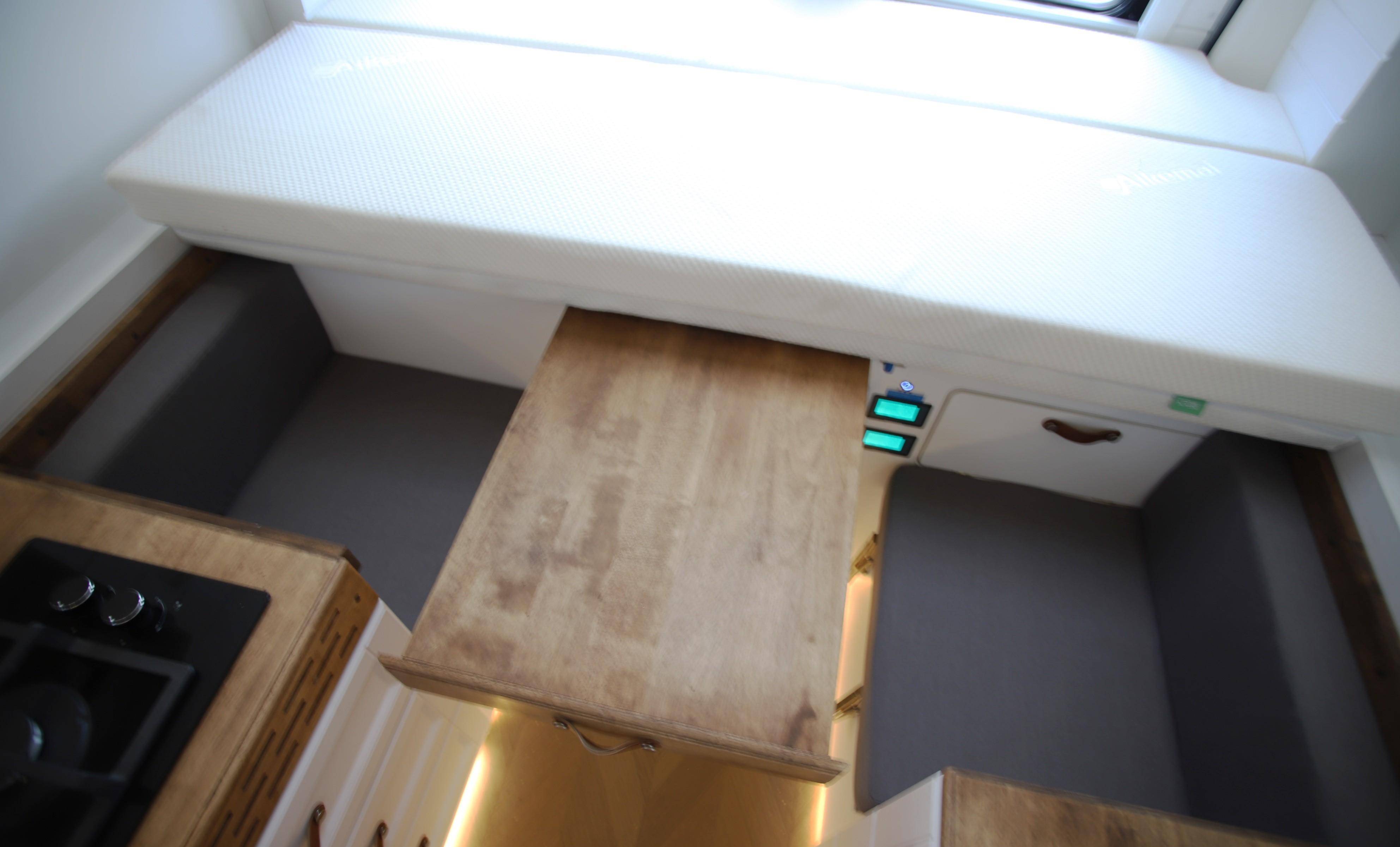 车尾横置床,采用拓展设计,不拓展纵深为1m,拓展开后,整张床的尺寸达到了1.5m,宽度得益于两侧的外拓盲窗达到了2m长,睡2人轻松自由。