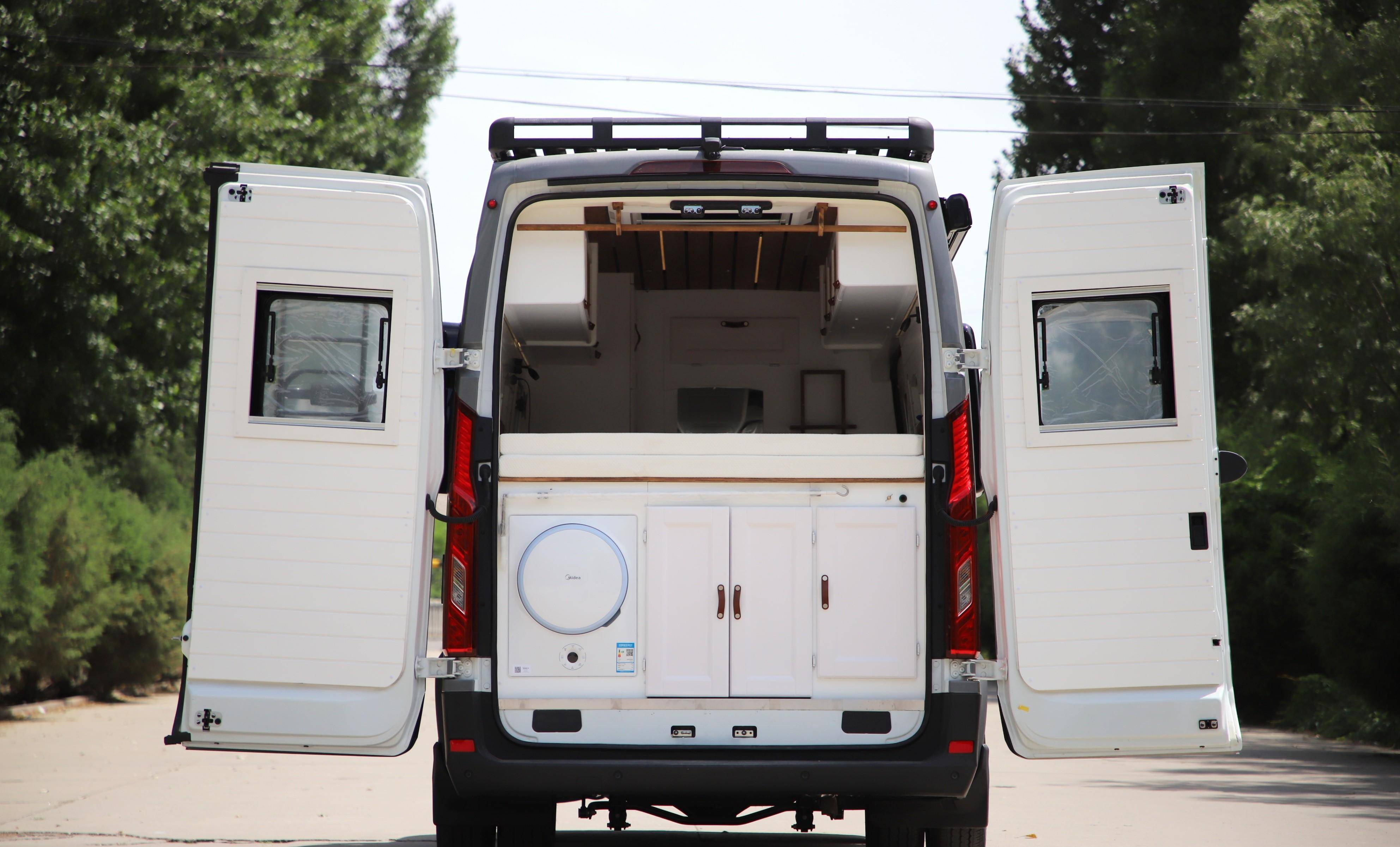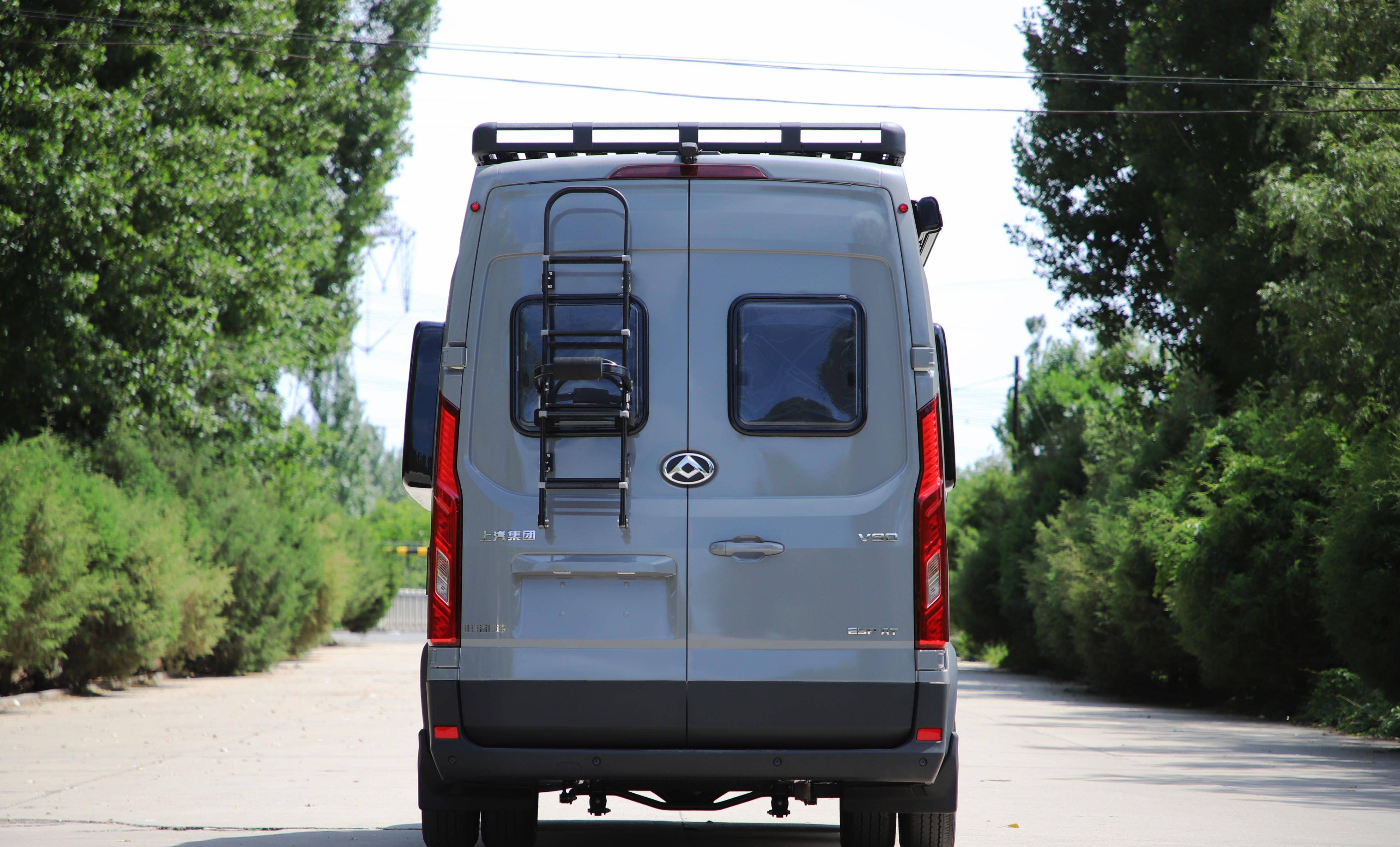 车尾以平开门设计,每扇车门均安装一扇车窗,提升车内的换气和观察角度。在左侧车门上还加装一部后爬梯,便于上车顶放置行李。