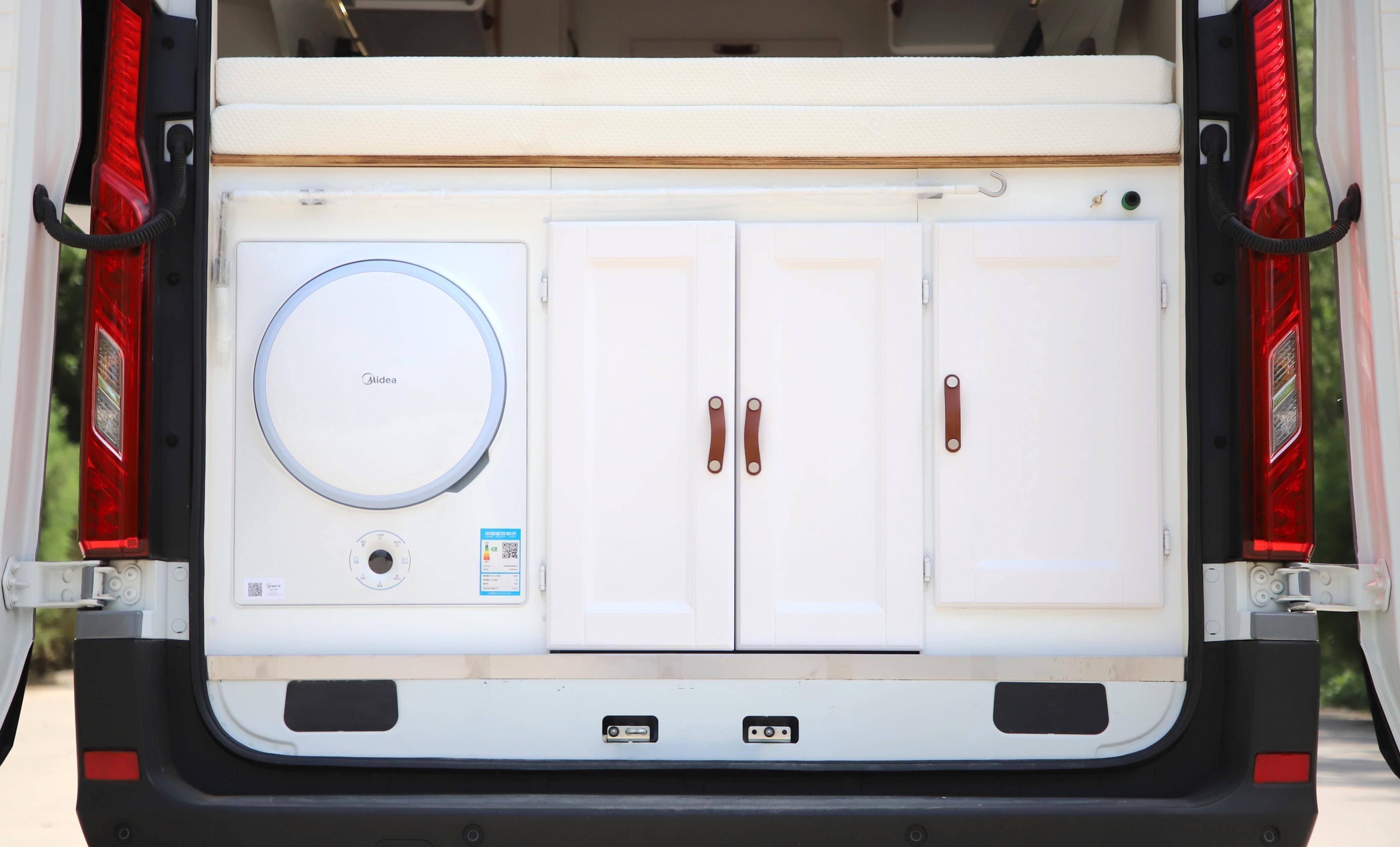 中间与右侧为储物空间,与车内连通,取物存储非常好用。左侧为一台3KG滚筒洗衣机,在上方还加装有外置取水口,户外洗漱、洗水果更为方便。