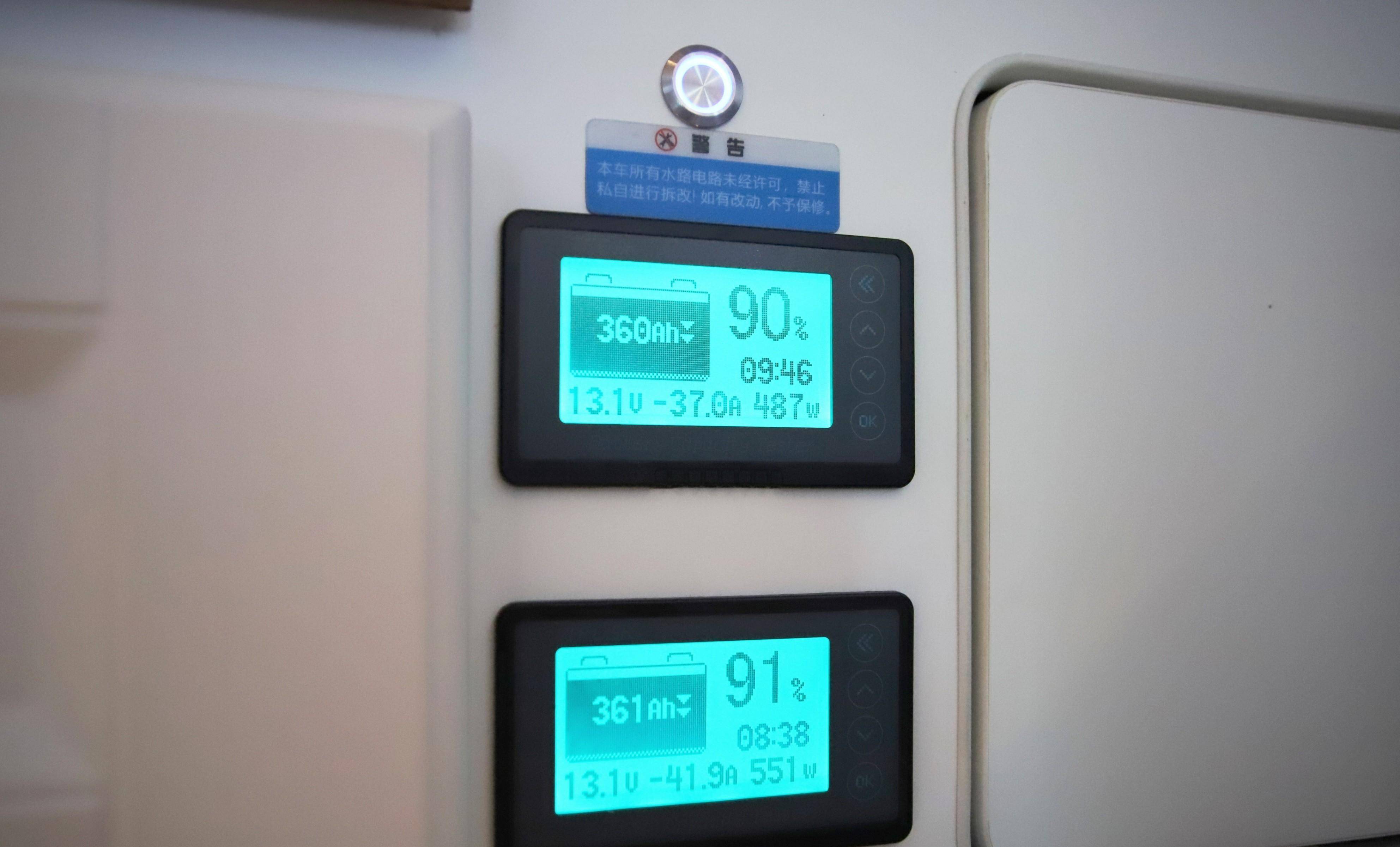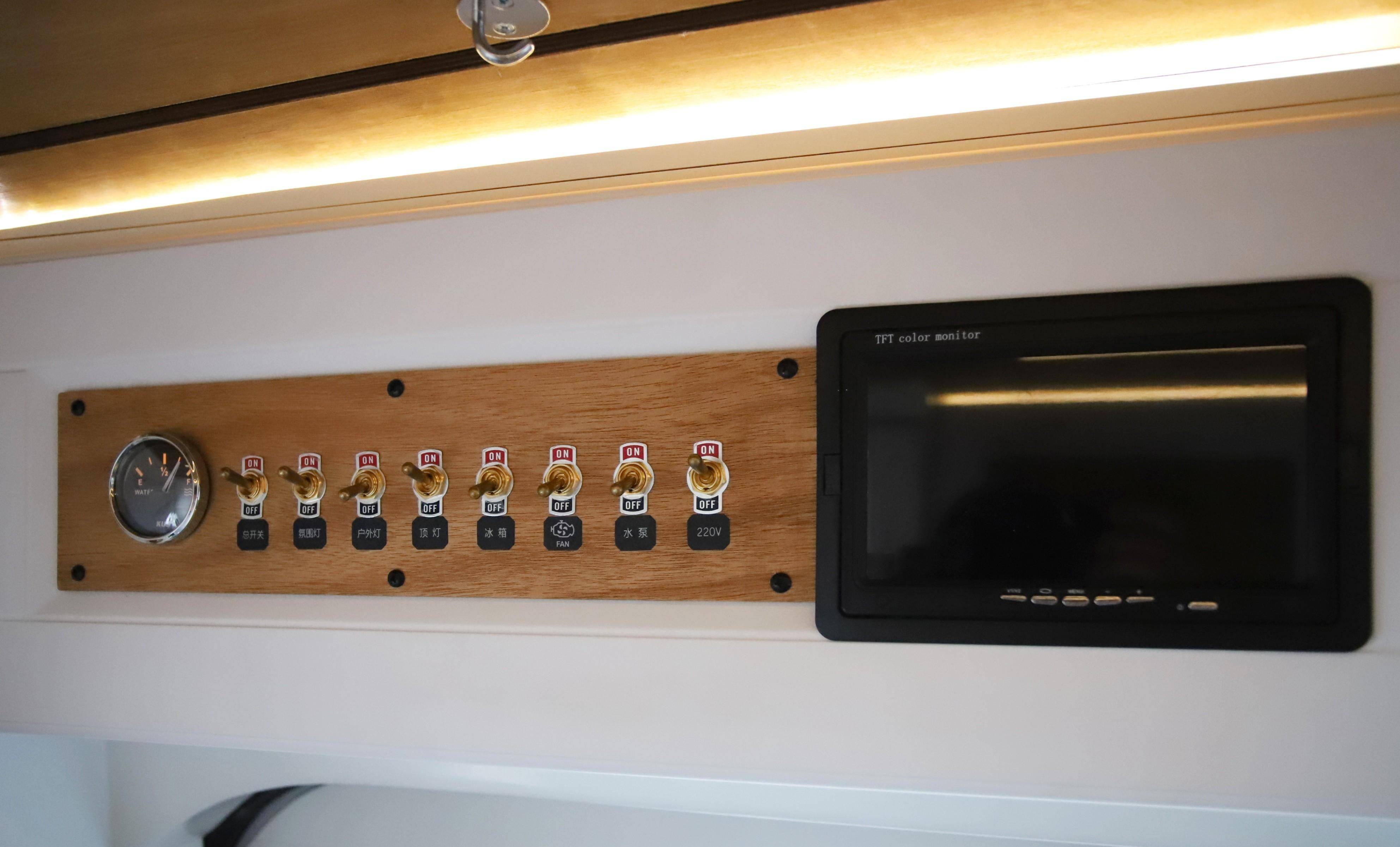 最后,来说下全车的水电系统。用电部分,这款车基于12V构建,配备有800Ah房车专用锂电池、6000W冲你变一体机、400W太阳能电池板;用水部分,安装有120L清水箱、50L灰水箱、20L热水装置。