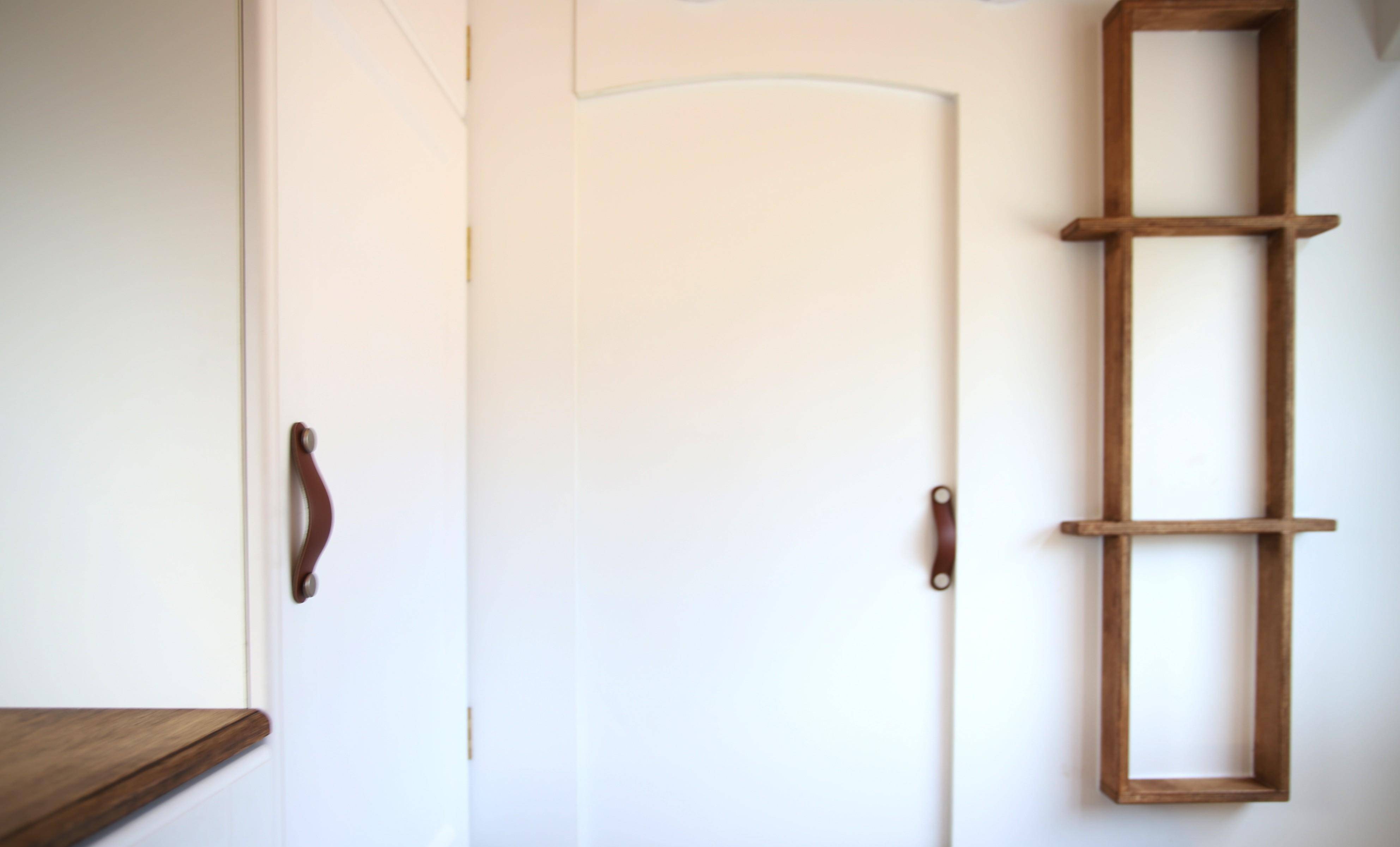 值得注意的是,驾驶室与生活区采用全隔断设计,使用一扇推拉门隔开,在不影响前后贯通的情况下,又保证了整体的私密性。侧滑门右侧单独配有一个储物架,放书或者插画,为车内增添一份色彩和温馨感。