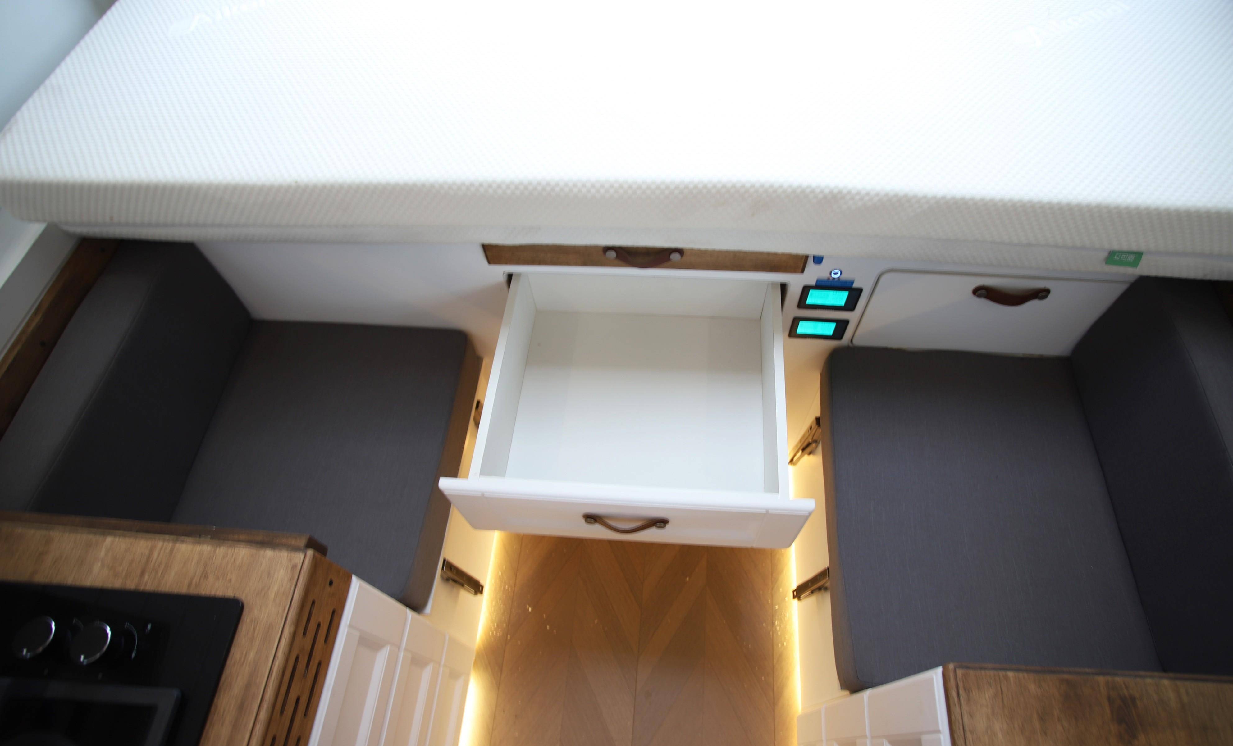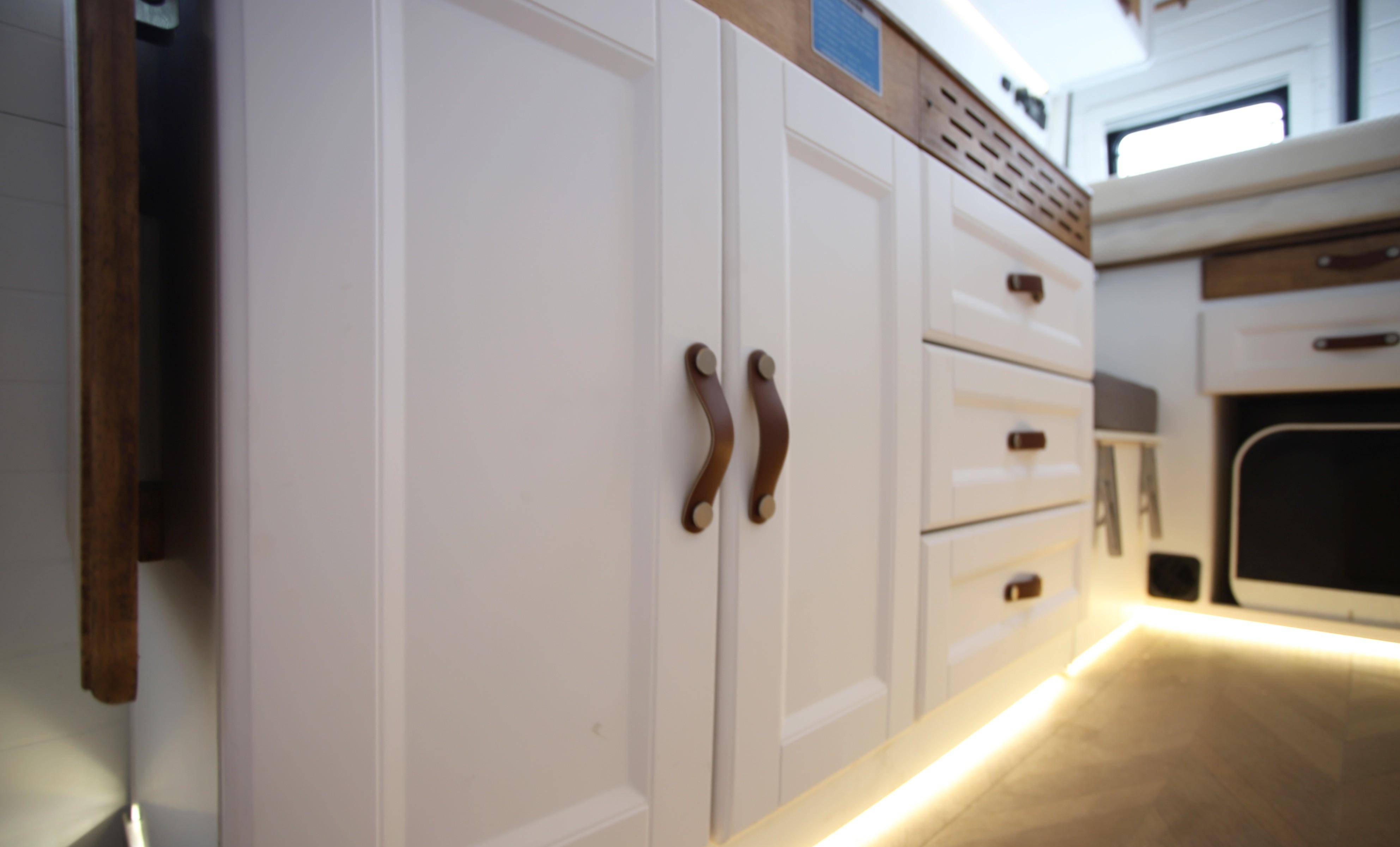 内侧为储物区和冰箱区。顶部储物柜可存放衣物,下方内嵌一台85L房车专用双开门冰箱。