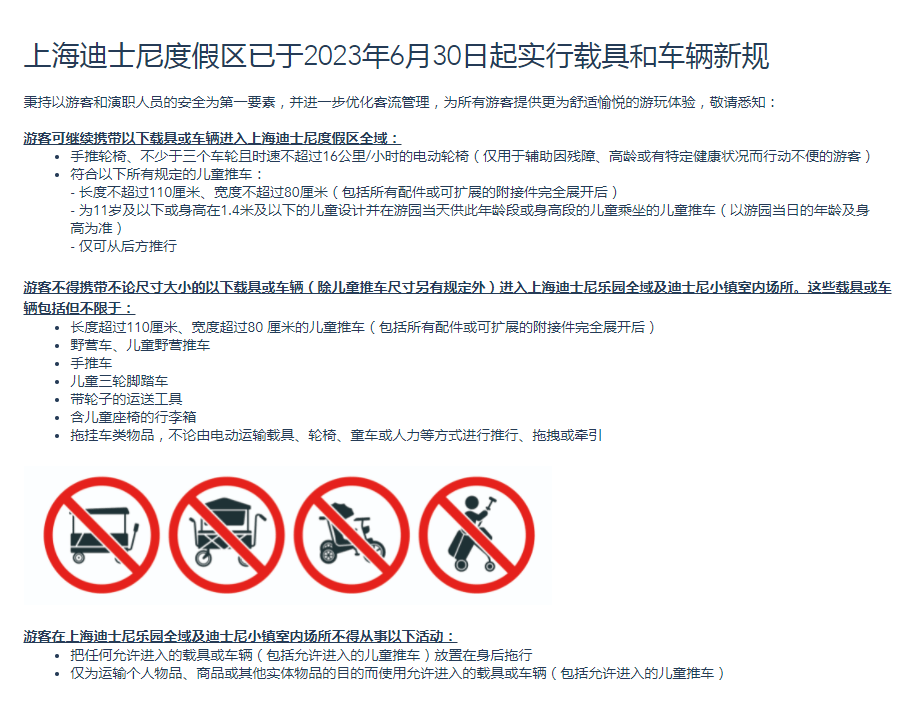 上海迪士尼度假区6月30日发布消息称,上海迪士尼度假区已于今日起实行载具和车辆新规。