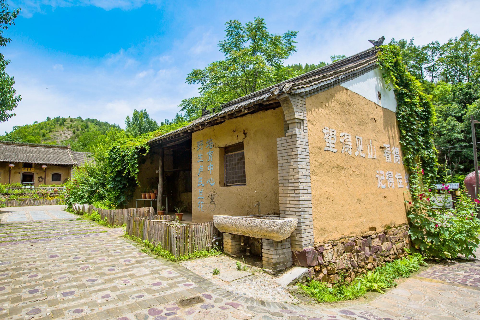老旧的石槽立在窗下,土黄色的墙壁、黑褐色的瓦,中原农村民居的斜屋顶都充满了怀旧感,很容易就让人想起小时候在乡间无忧无虑的日子,在乡间奔跑嬉戏,在村中招猫逗狗,又傻又纯真。