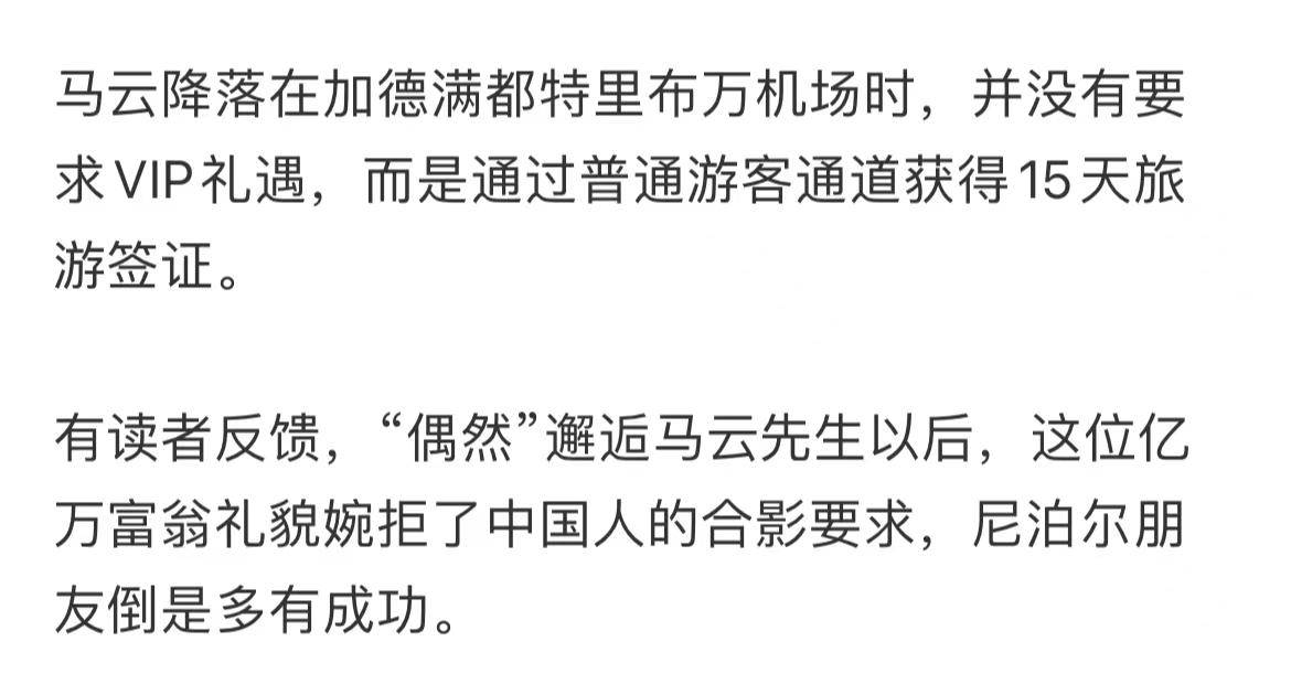 在巴德岗古城时,马云身着紫色T恤搭配卡其色牛仔裤,戴着鸭舌帽与当地人合影,笑得十分开心。然而有网友透露,当时他去找马云合照却遭到了拒绝,转头马云又去与当地人合影,这种做法令人感到不解。
