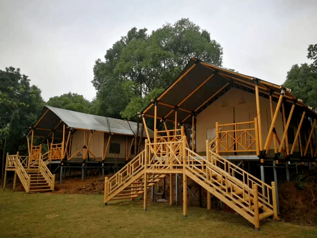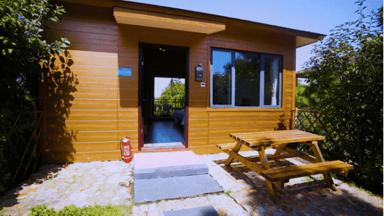 木屋营地是以天然木材为建筑材料,居住感全面升级。木屋别墅依山而建,四面环绕着绿植,露天的阳台让人与大自然更加亲近。在灯光装饰下仿佛走进了童话森林。