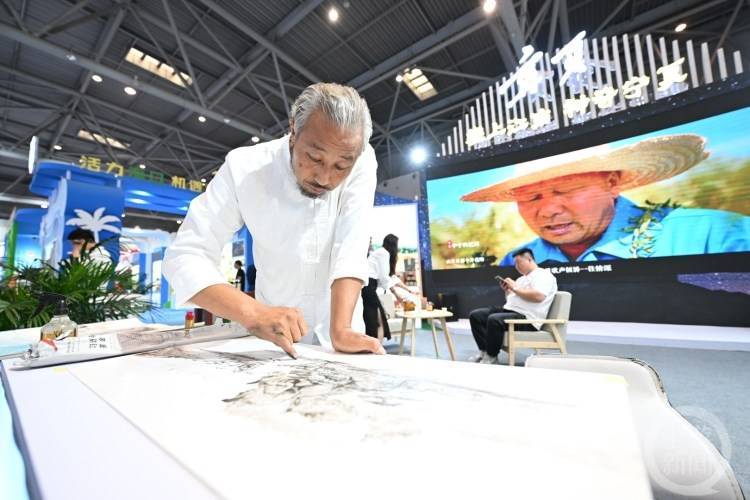 △宁夏展区,一位老艺术家正在创作指画。