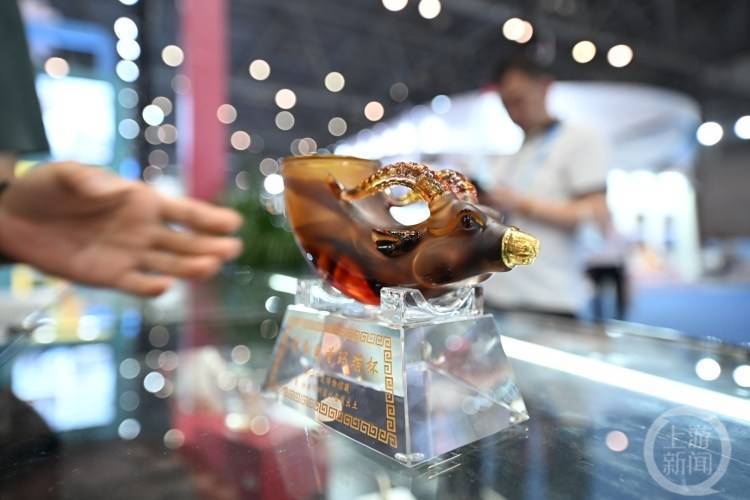 “大家可以买回家这个是用琉璃做的。”赵慧介绍,其原始文物就是唐时古人喝酒、做游戏用的酒杯。“阔口这边倒酒进去,另一头的塞子打开就可以直接喝。按当时的规矩,输了的人是要一次喝这么一杯的。”
