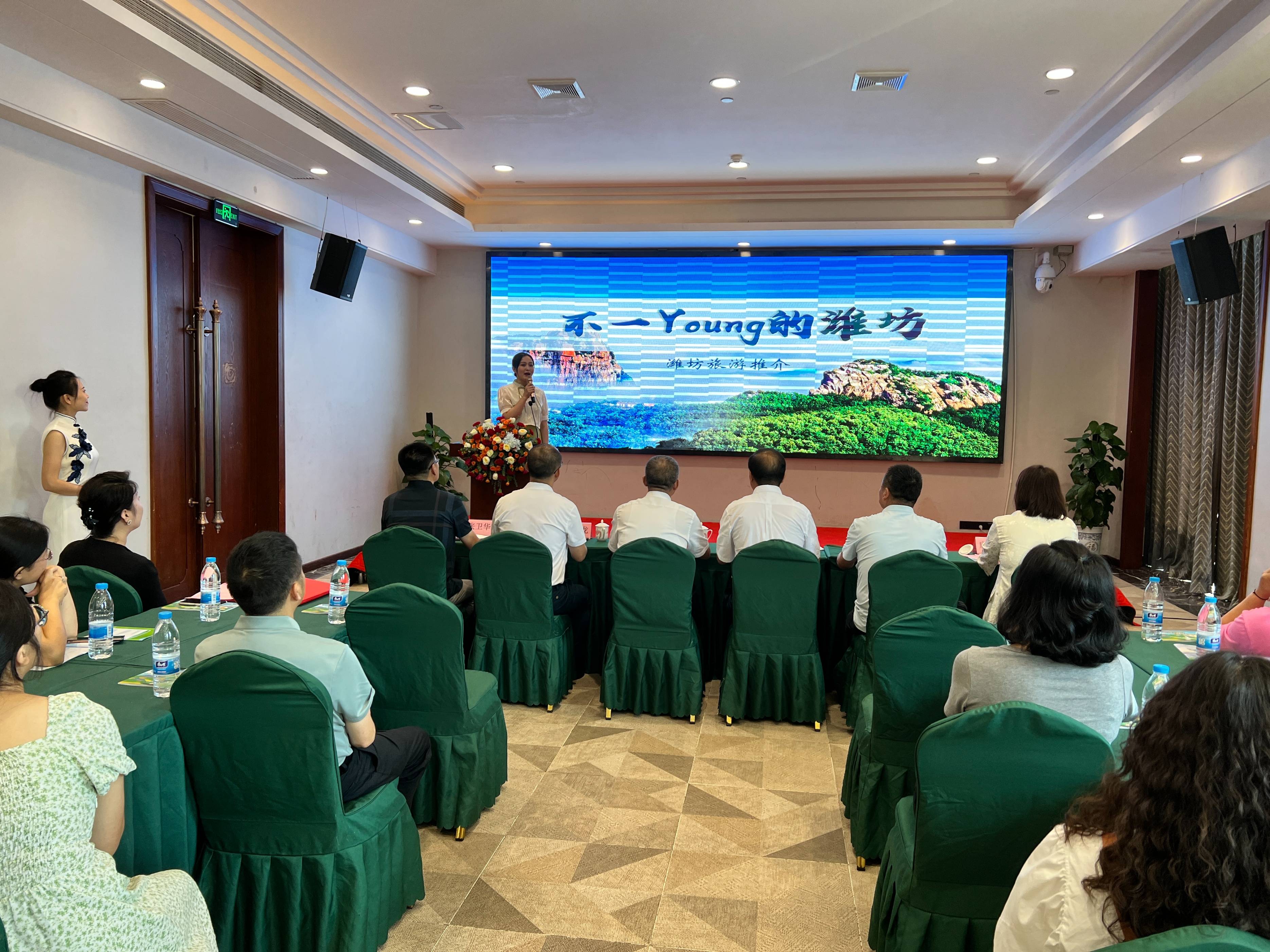 推介会现场,与会人员共同观看了潍坊旅游宣传片《遇见更好潍坊》,来自潍坊的旅游推介官详细介绍了潍坊的自然风光、文化底蕴和旅游资源,推介了潍坊丰富的文化、自然、康养等旅游产品;并诚挚的邀请全国的朋友亲临潍坊体验,“期待在潍坊最美的时刻遇见你”。