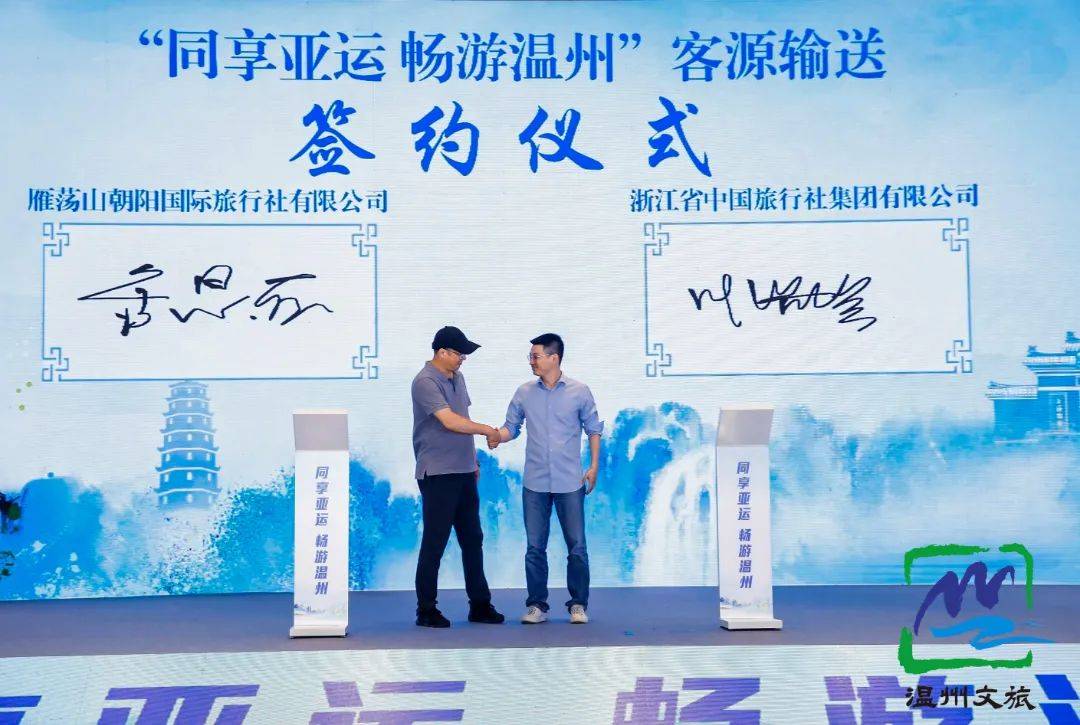 现场,浙江省中国旅行社集团有限公司、温州幸福国际旅行社有限公司、温州顺达国际旅游有限公司分别与乐清市雁荡山朝阳国际旅行社有限公司、杭州西子国际旅行社有限公司、杭州国大假日旅游有限公司签署“同享亚运 畅游温州”客源输送协议。