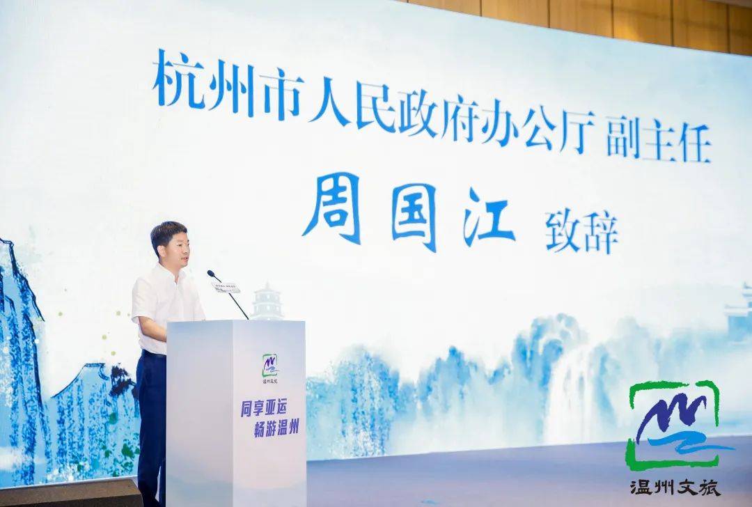 杭州市人民政府办公厅副主任周国江在致辞中表示,温州与杭州地缘相近、人缘相亲、情缘相通。相信通过此次推介会,将促进两地文旅产业双向赋能,更深层次、更高水平发展,在互建互学中共创两地美好明天!温州的山水之美、人文之美也会吸引更多杭州市民的目光和脚步。