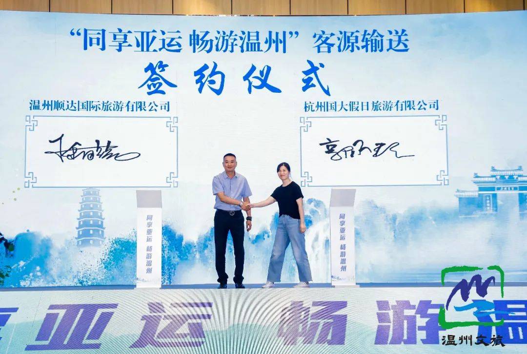 6月30日,2023温州文化旅游推介会在杭州正式举办。温州市人民政府向杭州市民游客发出热忱邀约:同享亚运,畅游温州!