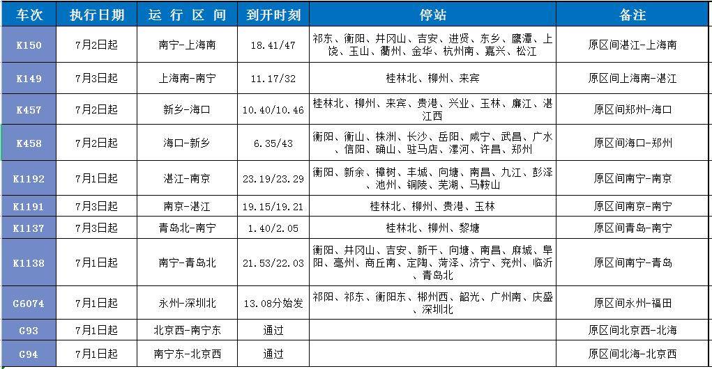 永州新闻网讯(通讯员张玲)笔者从铁路部门获悉,7月1日零时起,铁路部门对列车运行图进行一次较大幅度的调整。根据此次调图方案,永州火车站新增旅客列车2趟,到开时刻有所变化的旅客列车52趟,调整区段、经由的旅客列车11趟,停运旅客列车8趟,取消增加停点的旅客列车15趟(具体见附表)。