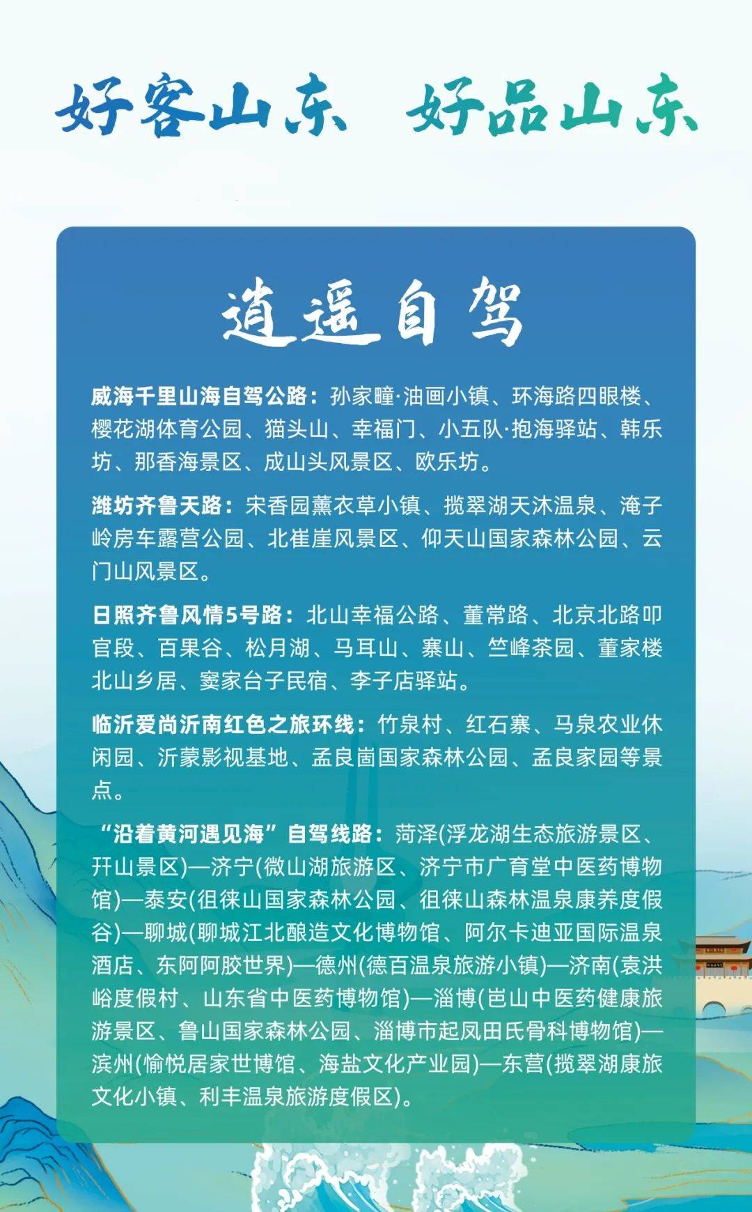 逍遥自驾串联“沿着黄河遇见海”、千里山海、齐鲁风情5号路、“齐鲁天路”等多条自驾体验绝佳的出行线路,让自驾游客一“驾”为快。齐鲁天路蜿蜒200余公里,沿途美景星罗棋布,一路上看齐鲁桃海、观辉渠梯田,尽揽壮美风光。沿着画有彩虹的齐鲁风情5号路一路驰骋,山光水色相应和,彩霞漫天处层层山峦渲染出醉人景色。千里山海自驾公路则依山傍海,干净的白色房子与蓝色大海如油画般映入眼帘,踩下油门,疾驰在山海之间,自由的灵魂在此高歌。