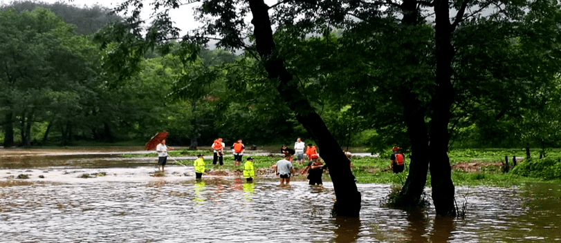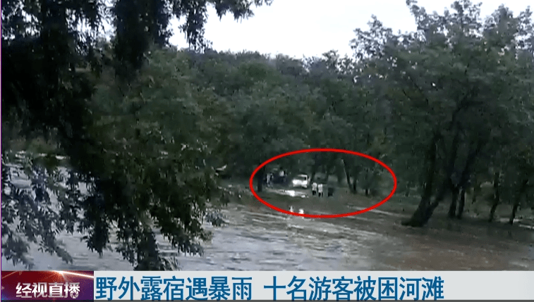 十名群众当中有六名大人,四名小孩,最小的不到三岁。这些群众是头一天晚上到河滩上露营,结果半夜突降暴雨,河水上涨比较迅猛,他们到5点钟起床发现,帐篷里面已经进了水,水深大概有三十厘米。