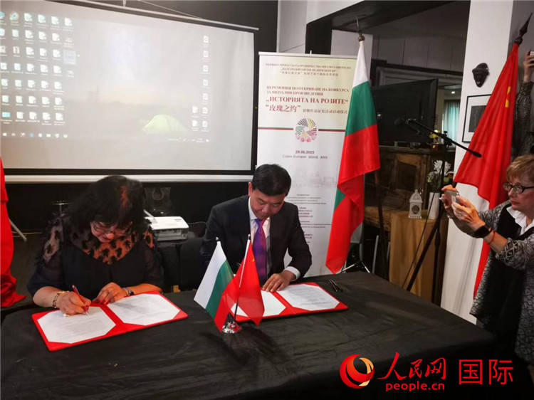 中国记协书记处书记田玉红(右)与保加利亚记联主席托多罗娃在索非亚签署“中保记者之家”共建备忘录。人民网记者 苑基荣摄