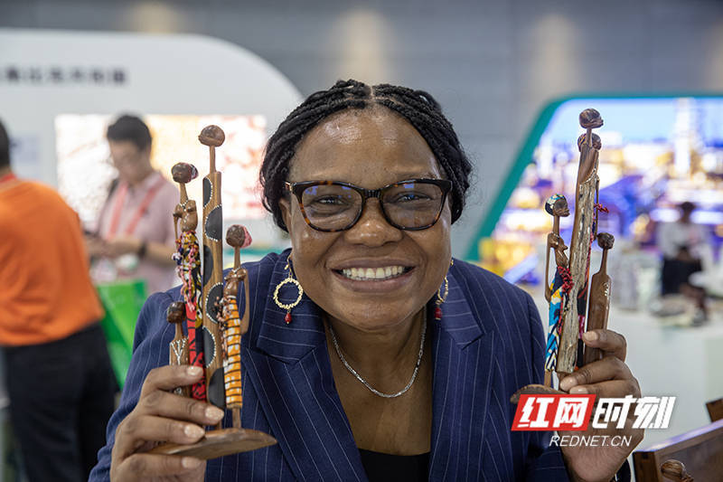 马拉维展商拿起本国生产的木雕娃娃展示给观众。