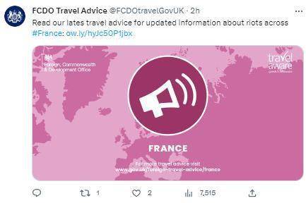 30日,英国外交、联邦和发展办公室(FCDO)发布旅行建议官方账号发推,更新赴法旅行建议 推文截图