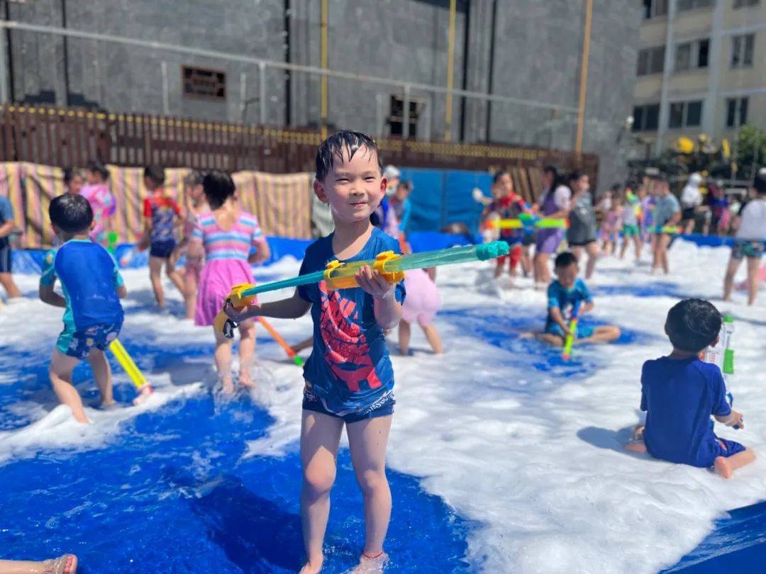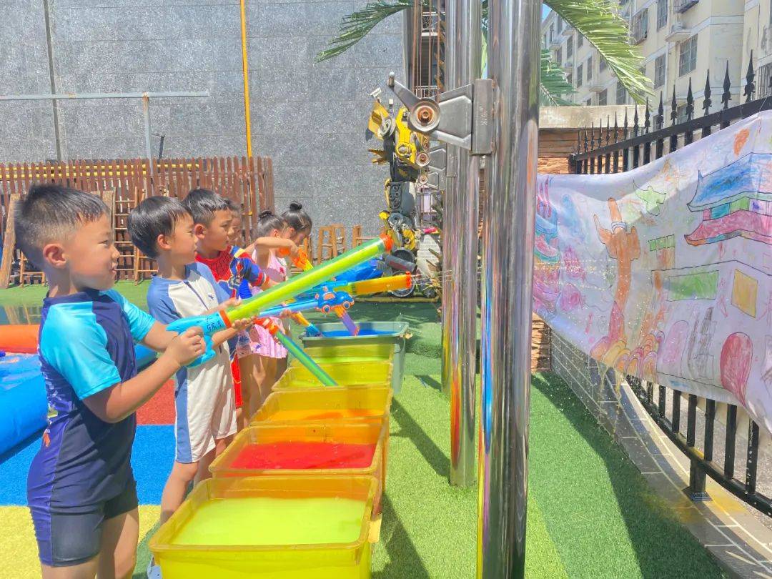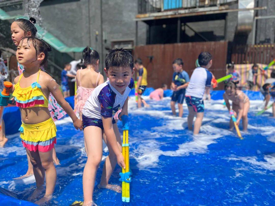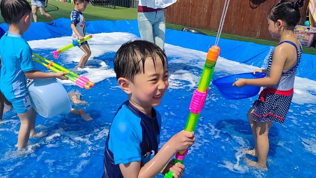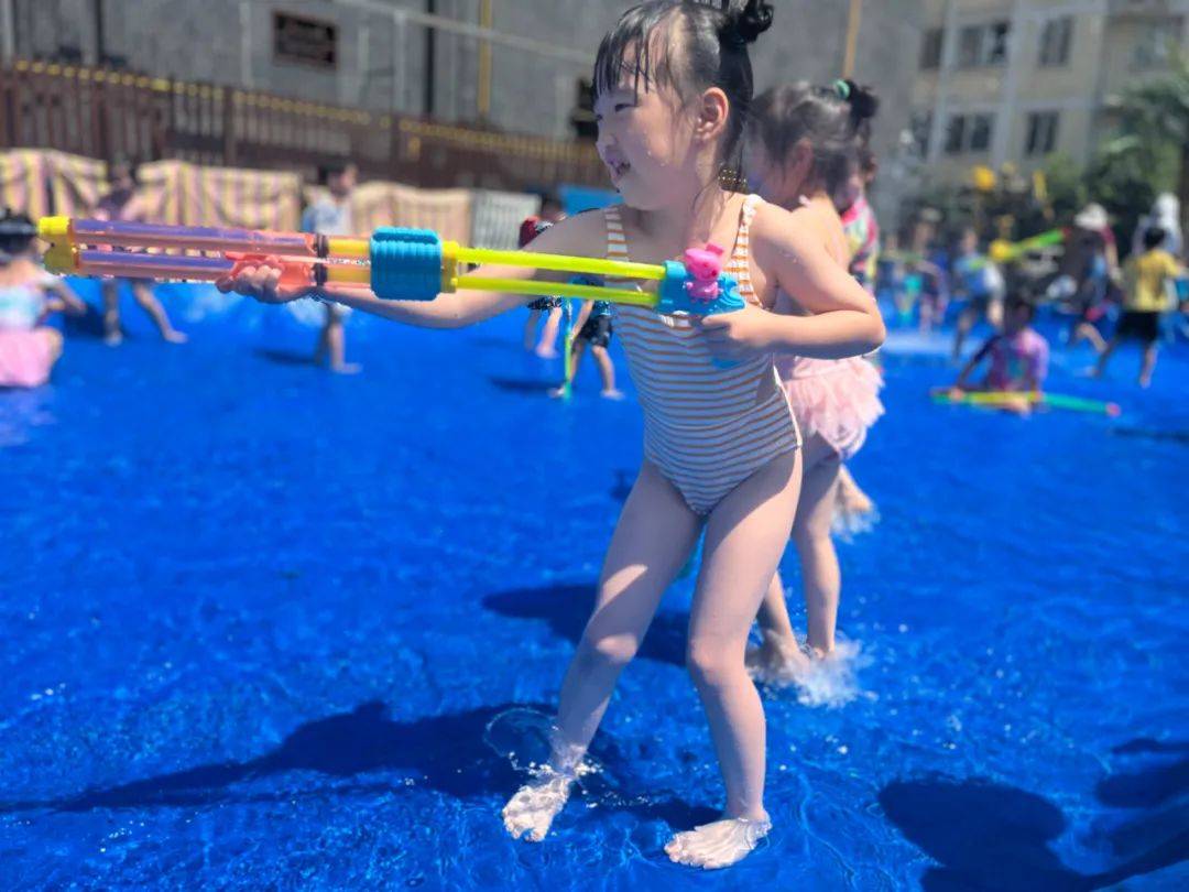 看,孩子们身穿各种各样的泳衣,拿着各种各样的水枪,犹如一个个跳动的彩色音符,他们闪亮登场啦,不同的装备,不一样的容器,各式水枪,“火力全开”尽情撒欢。