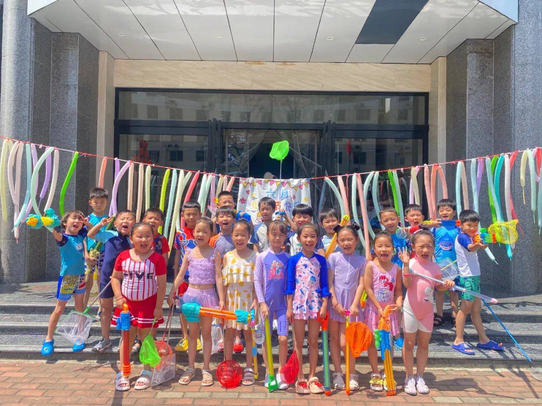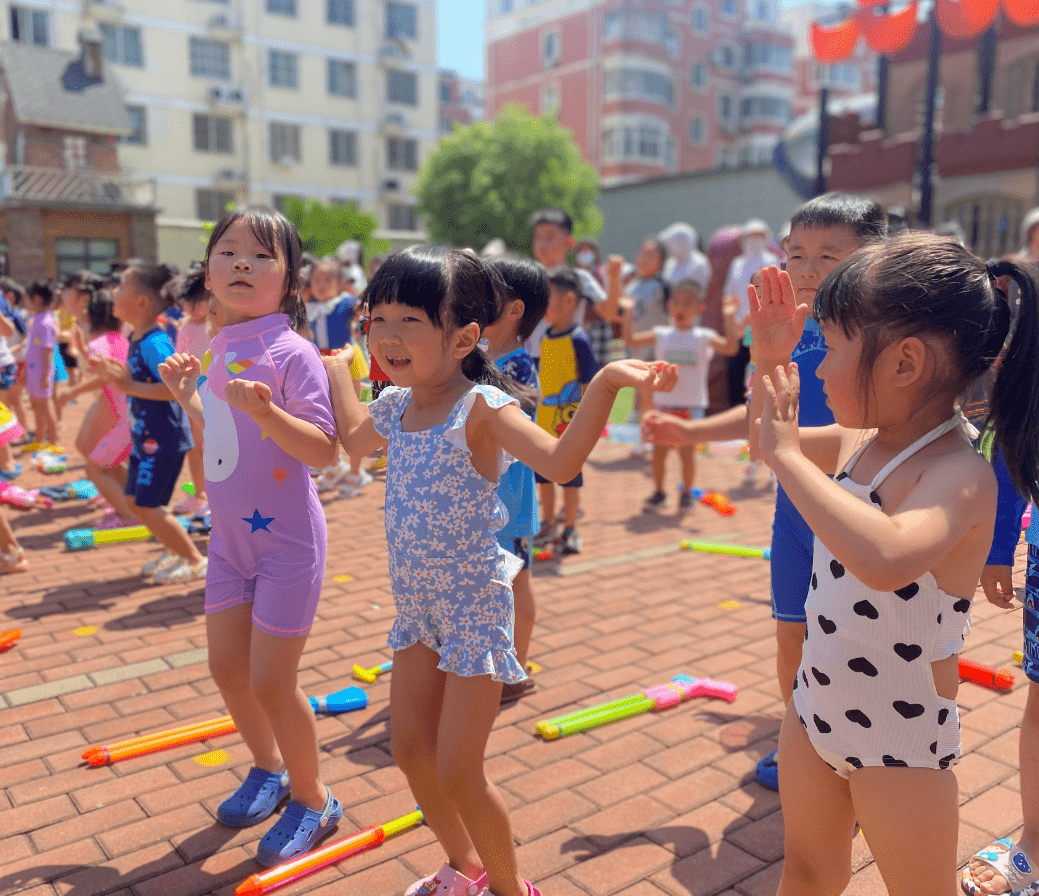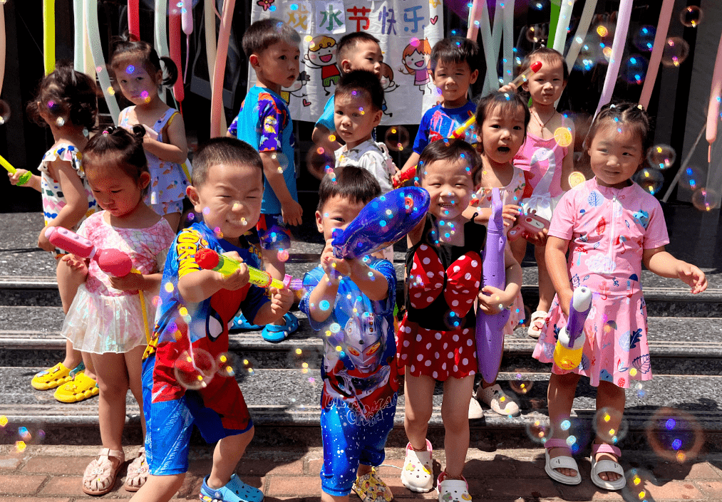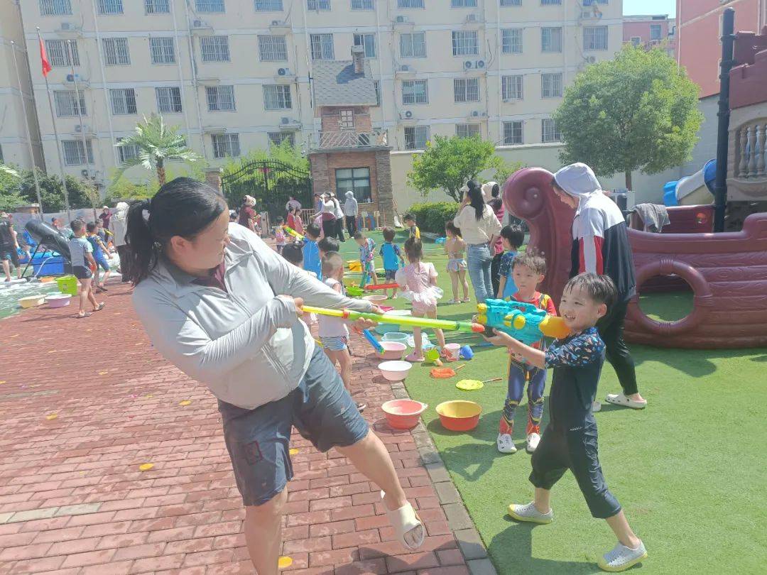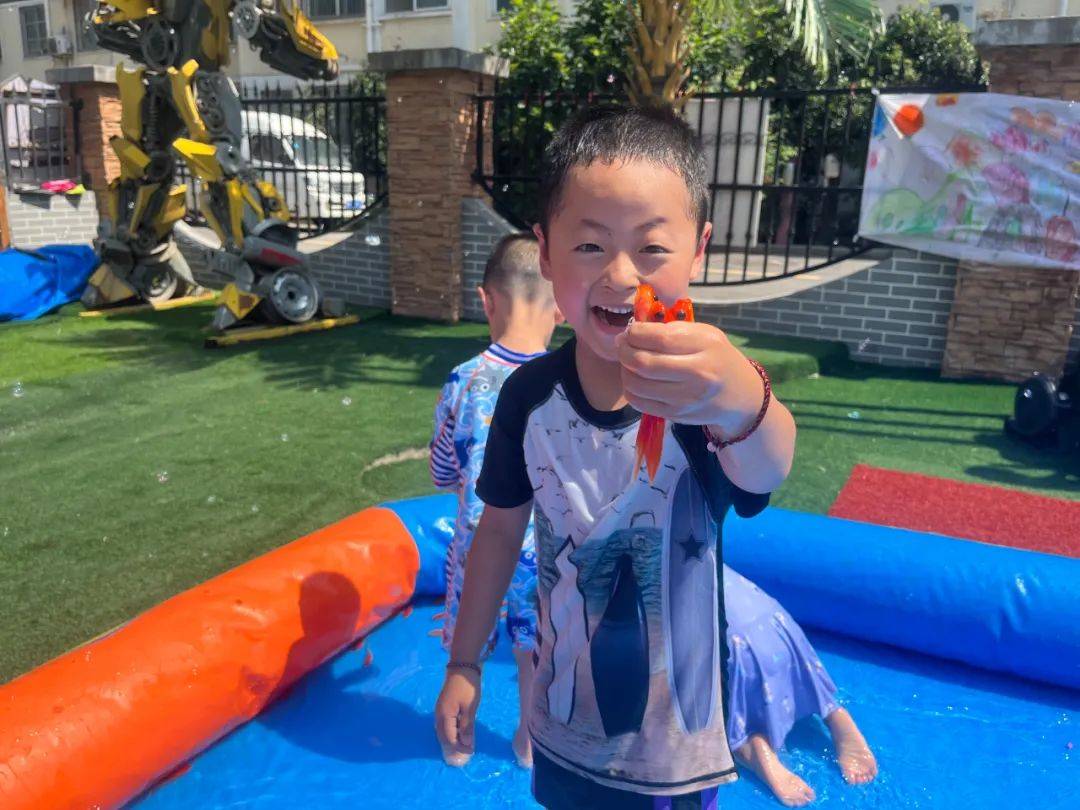 看,孩子们身穿各种各样的泳衣,拿着各种各样的水枪,犹如一个个跳动的彩色音符,他们闪亮登场啦,不同的装备,不一样的容器,各式水枪,“火力全开”尽情撒欢。